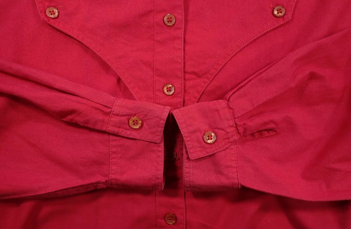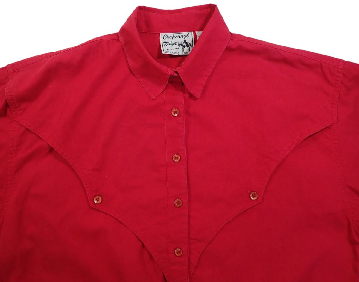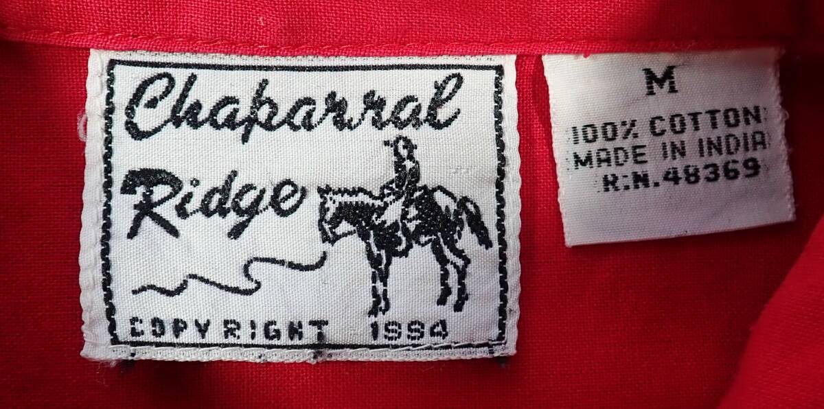 備考 寸法的にもメンズのMサイズですが合わせが右前になります。ウエスタンシャツ等で稀に右前のメンズを見ることがあります。Chaparral RidgeのしっかりとしたCOTTON素材に珍しいデザインの入った長袖ウエスタンシャツです。クリーニング、プレス済。