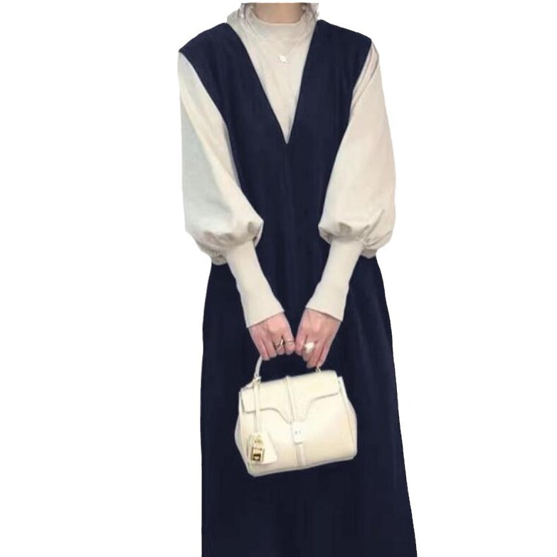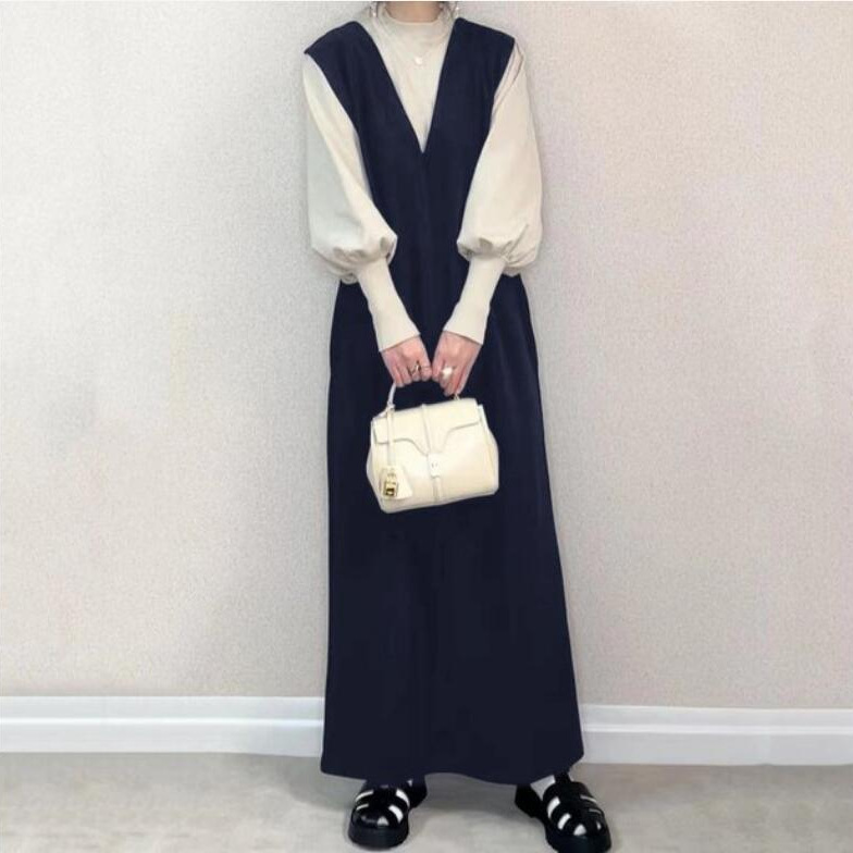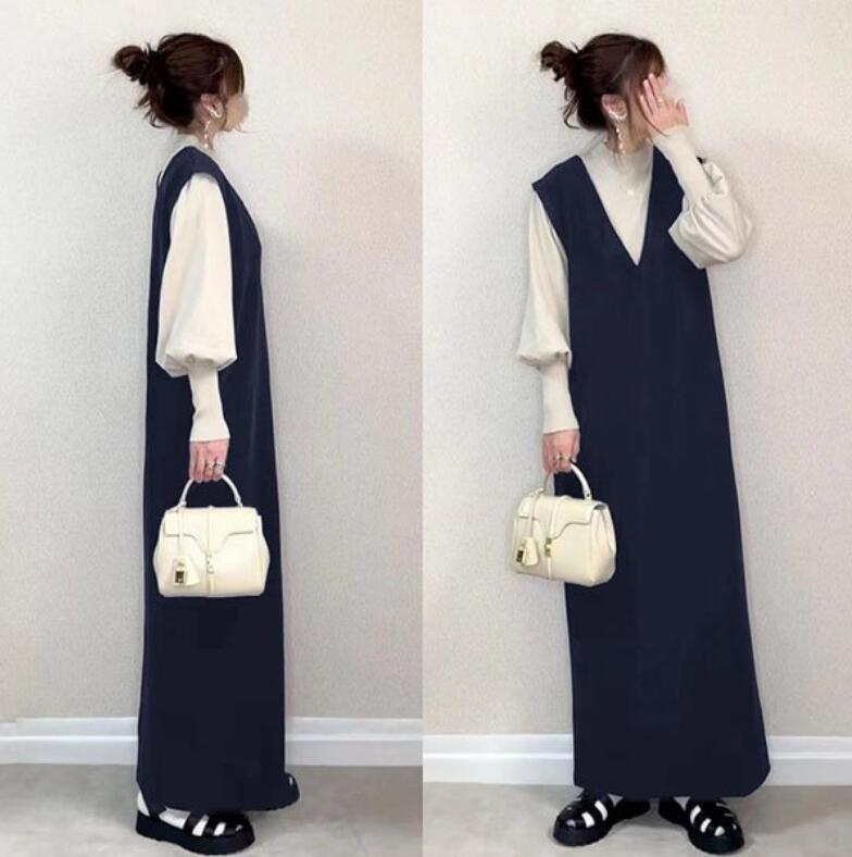 通勤秋冬 深Vネック ベストワンピース ジャンパースカート ロングワンピース 袖なし Aラインワンピース 大人カジュアルF