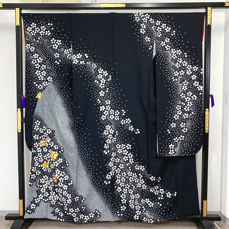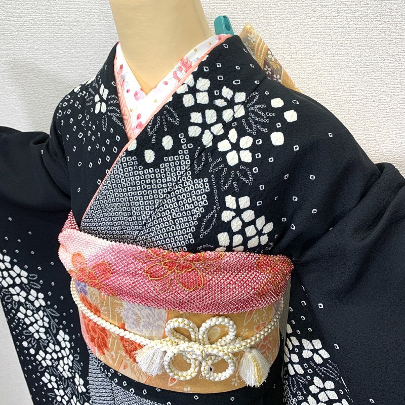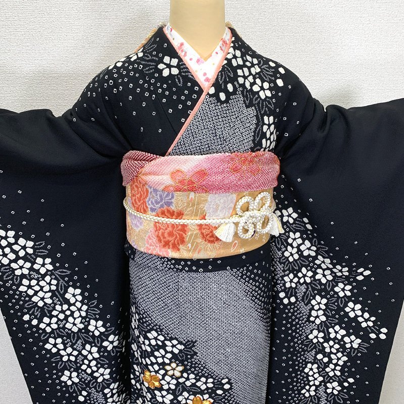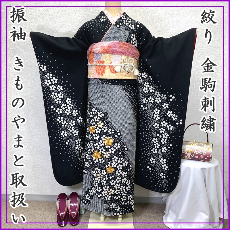 | 〇きものやまと取扱い 振袖 絞り 金駒刺繍 金彩 桜 花 黒〇美品 成人式 結婚式 (No.eid) きものやまと取扱い。黒地に絞りの花文様、桜の金駒刺繍が施された振袖です。シンプルな色合いですので、ワントーンのシンプルコーデや流行りのレースを使ったコーデなど、幅広く自分好みにコーディネートすることが可能です。 (画像の袋帯410y24、重ね衿、帯締め、帯揚げは参考商品ですが、在庫がある場合に限り+15,000円で振袖とセットでお譲りすること可能です。半衿(中古美品)は+1000円、草履バッグセット406v19は参考商品です。) USED品ですが、目立つようなシミ・ダメージもなく美品です。 【素材】正絹 【色】黒 *モニターによって色味は実際と異なる場合がございます。 【サイズ】