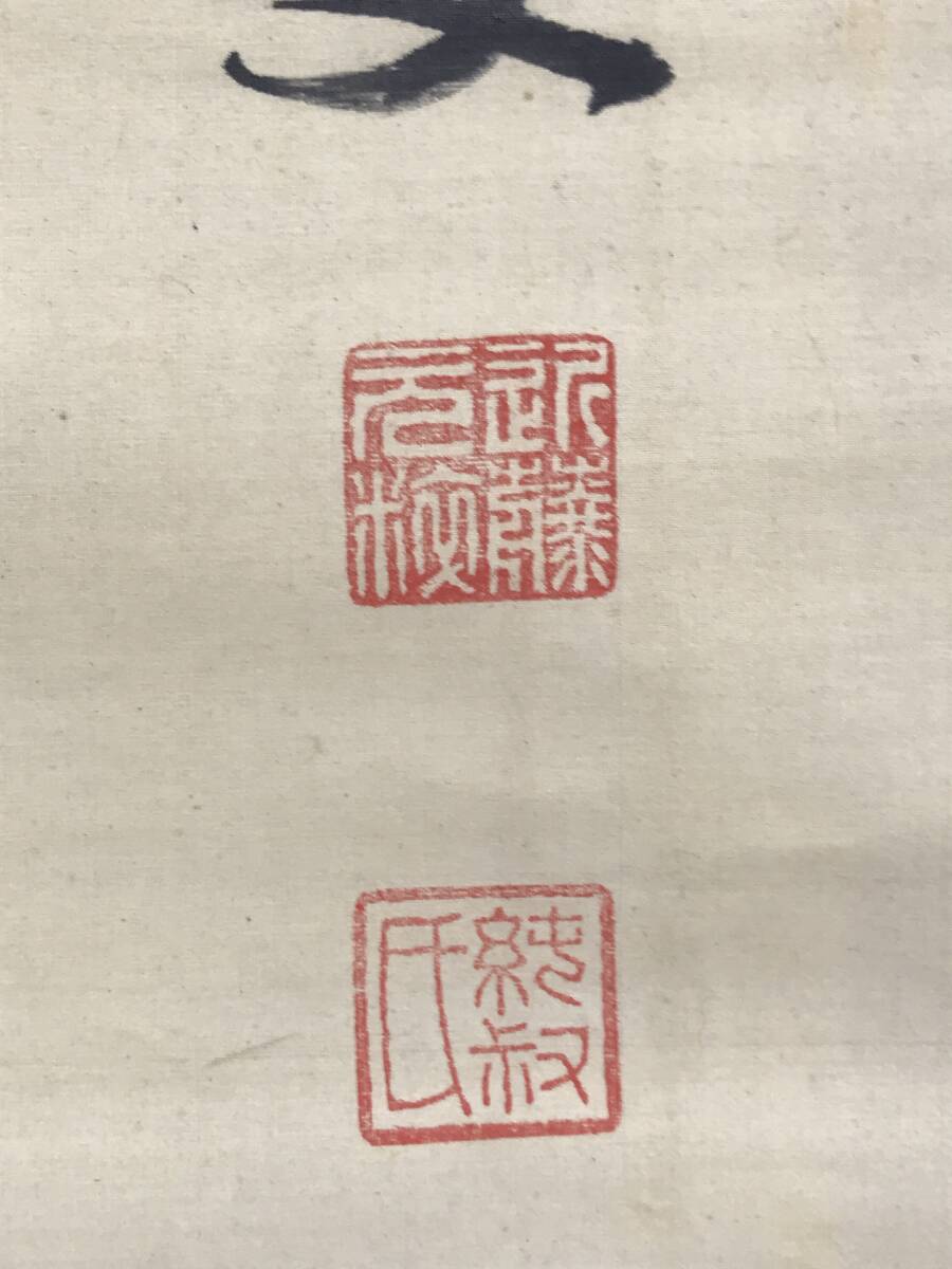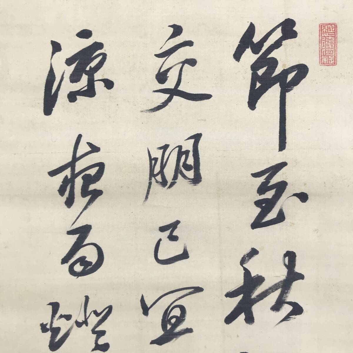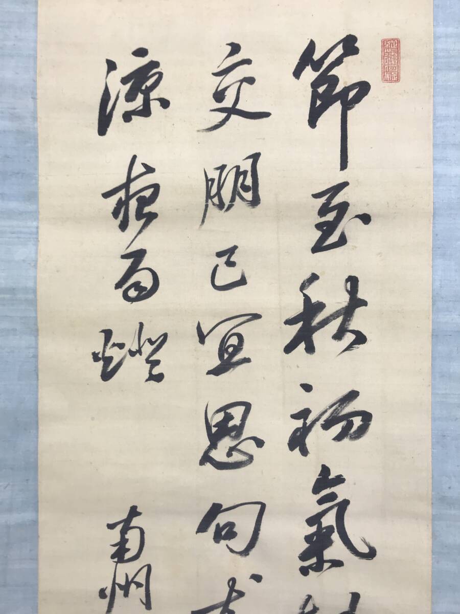 【作品状態】 本紙は絹本肉筆です。本紙は多少の薄汚れあります。表装は時代感あり、薄汚れ、全体に糊シミあります。