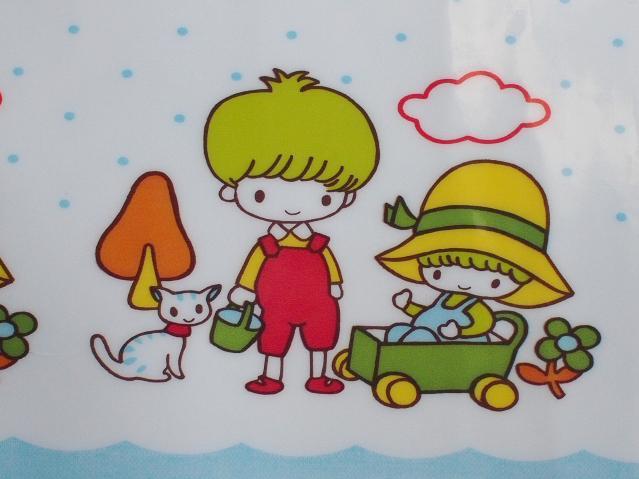 レトロキッチン日用品雑貨*ラスト2・ほのぼのした子供とネコちゃん水色水玉ビニール・40×125