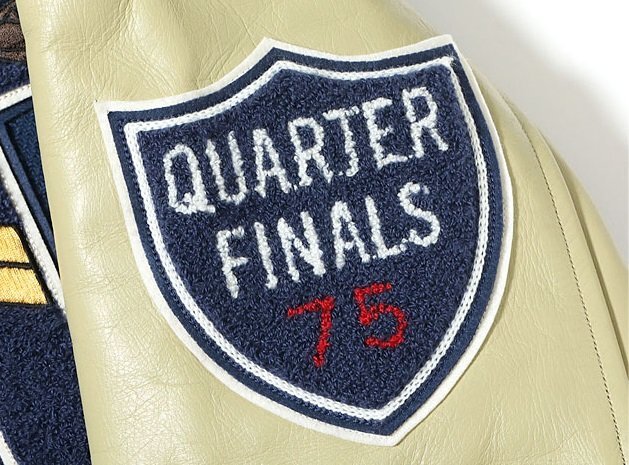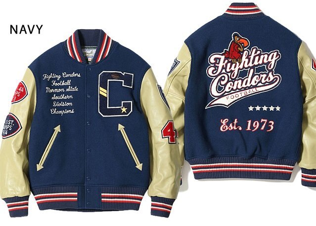 アメカジブランドWHITEVILLEから、30oz. WOOL MELTON AWARD JACKET 「FIGHTING CONDORS」(WV15603)のご紹介です! 30オンスのウールメルトンとステアハイドを使った頑丈なアワードジャケットのスタイルは1930年代に確立されました。 以降、現代までそのスタイルは愛され続けています。 この一着はゴールドとブラウンの配色で、クラシカルな雰囲気を醸し出しています。 またチェーン刺繍やシニールにも同系色を使用しており、統一感のある仕上がりとなっています。 ホワイツビルのアワードジャケットは身頃に防寒性の高い30オンスのウールメルトン、袖には魅力的な経年変化をみせる米国産のステアハイドを使用しました。 ライニングはレーヨンコットンのキルティングとなっており、保温性に優れると共に袖入れがしやすく、快適な着心地を誇ります。 | ||||||||||||||||||||