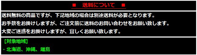 | (1).お届先が「北海道・沖縄・離島」(※商品によっては「東北」を含む)の場合は 別途送料が掛かります。 お届先の情報をもとに送料を設定させて頂きますので、お支払については 当店より送料のお知らせの後にお願い致します。 (2).一部商品については「個人様宅」へのお届の場合、別途送料が掛かる場合が ございます。 (3).送料のお問い合わせの際は、以下の情報をご連絡下さい。 ・お届け先の郵便番号 ・お届け先が「個人様宅」or「法人様」 |