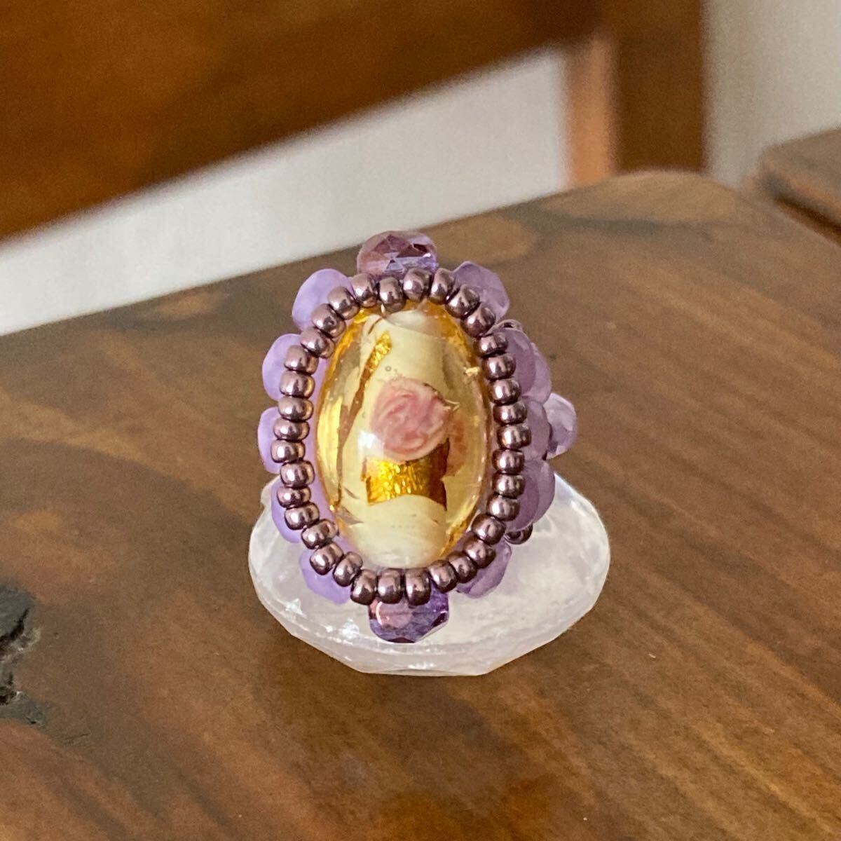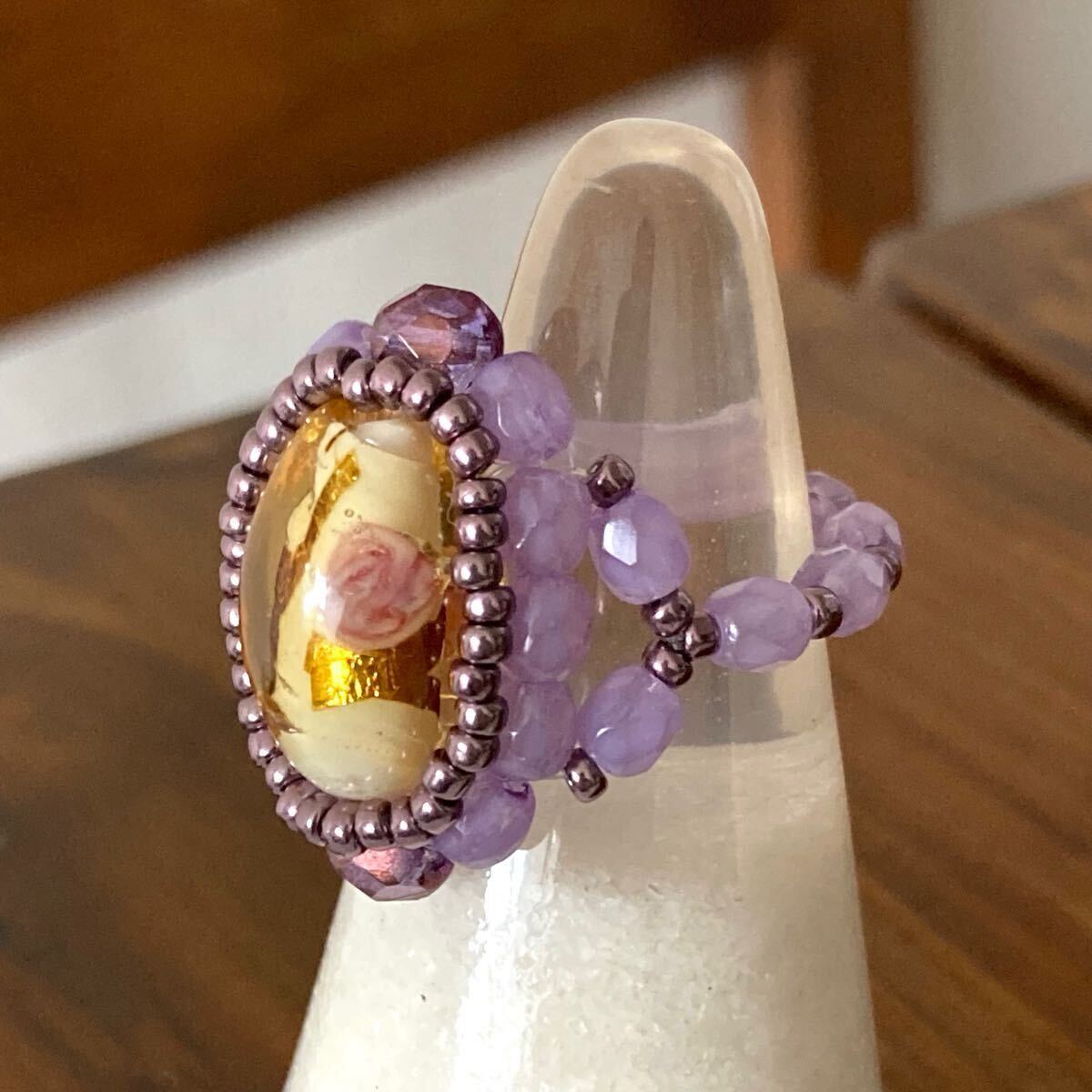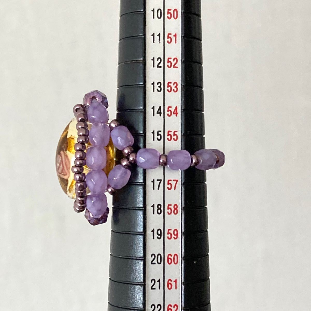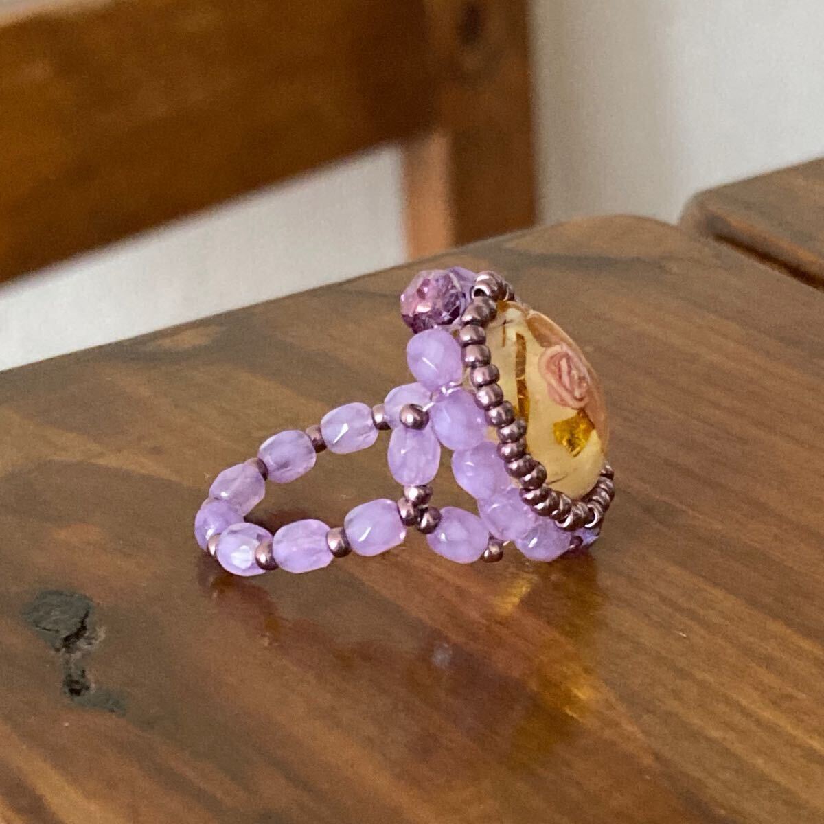 18mmのクリアトパーズの中にピンクのお花とゴールドが入ったランプワークビーズ、4mmのミルキーパープルのチェコビーズ、5mmのパープルのチェコビーズ、メタリックパープルの丸小ビーズで作ったリングです。