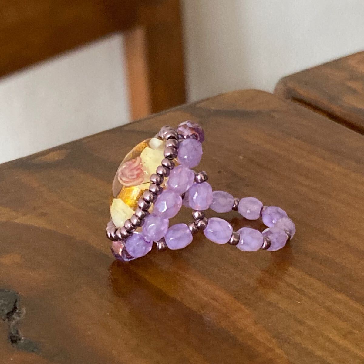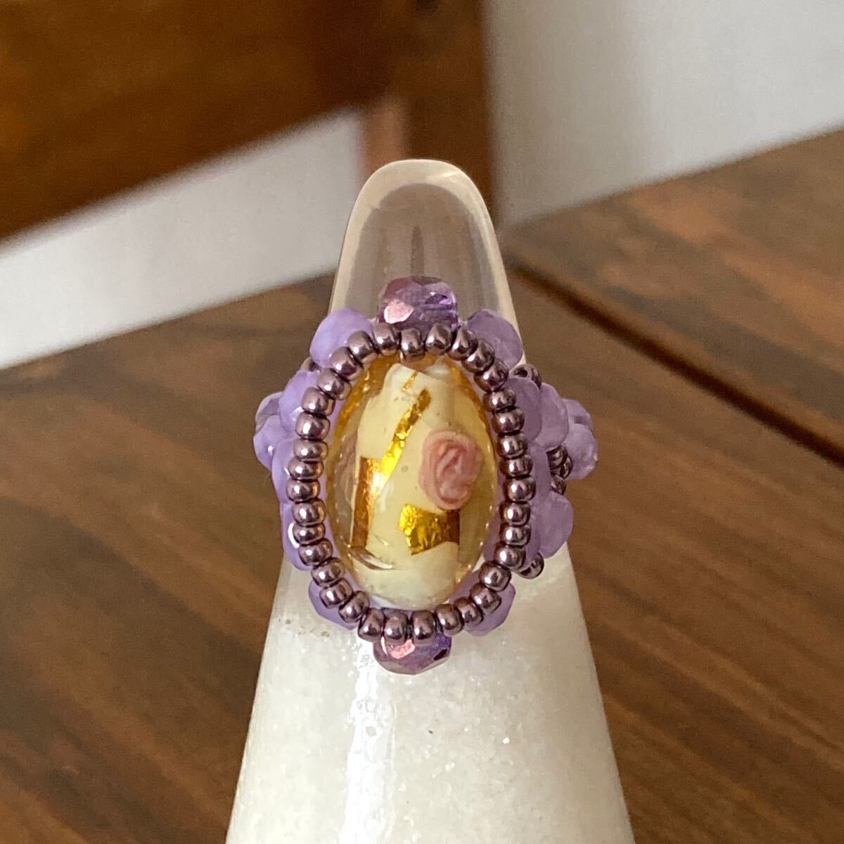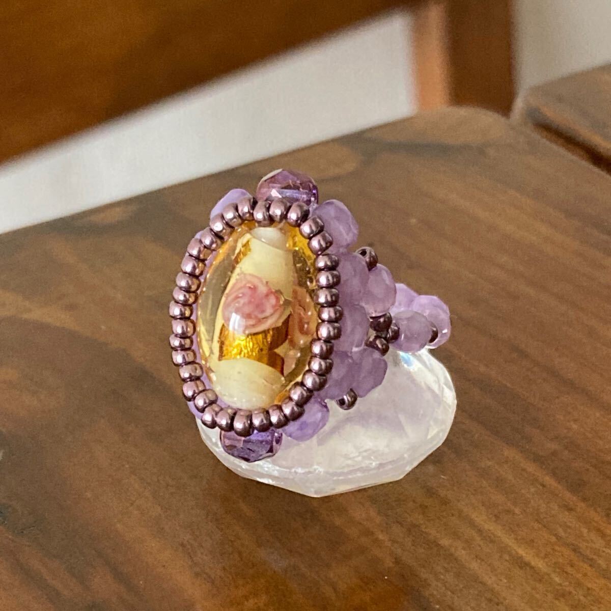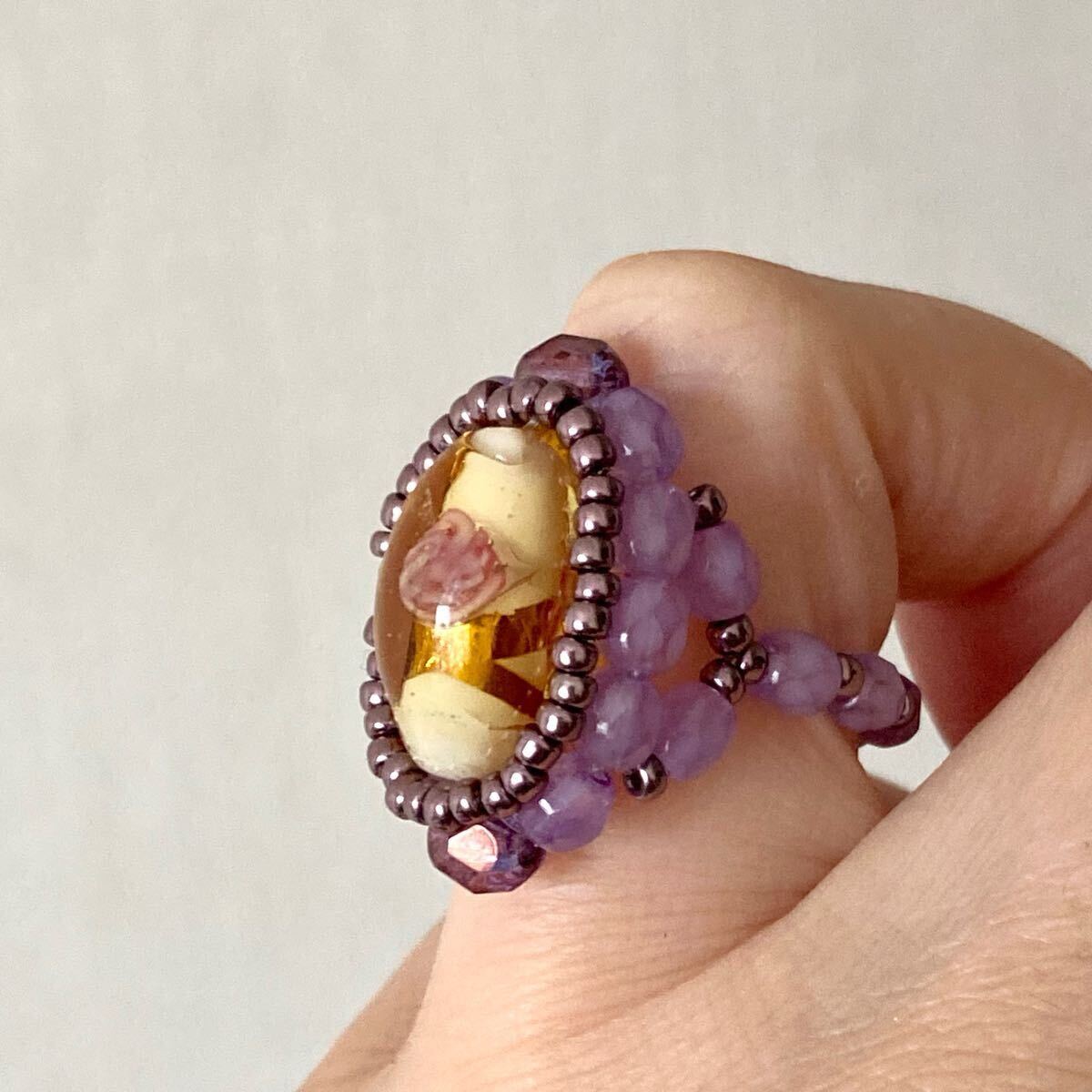 18mmのクリアトパーズの中にピンクのお花とゴールドが入ったランプワークビーズ、4mmのミルキーパープルのチェコビーズ、5mmのパープルのチェコビーズ、メタリックパープルの丸小ビーズで作ったリングです。