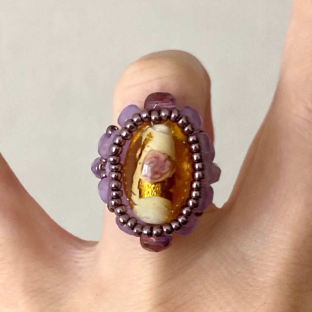 オーバル型のランプワークビーズを優しいパープルで包んだ可愛いリングです♪
