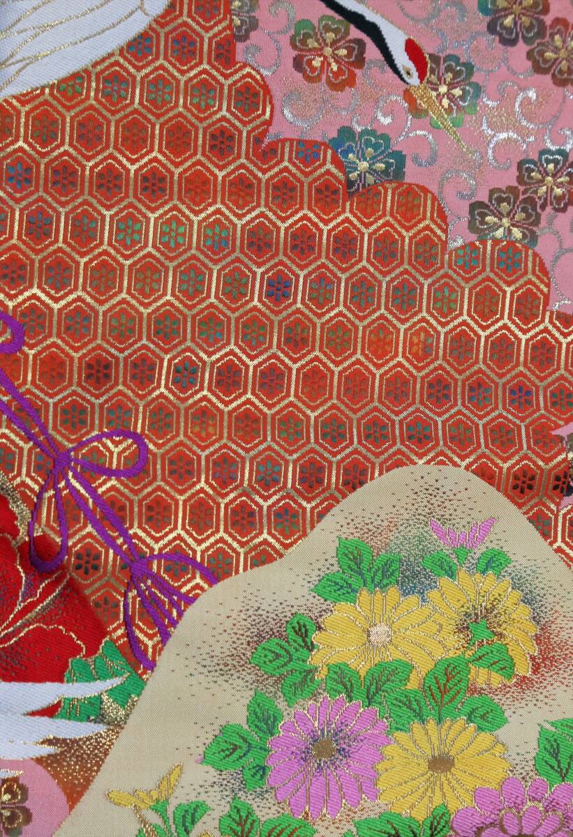 鶴や沢山の花々、細かく織られた柄が美しいデザイン