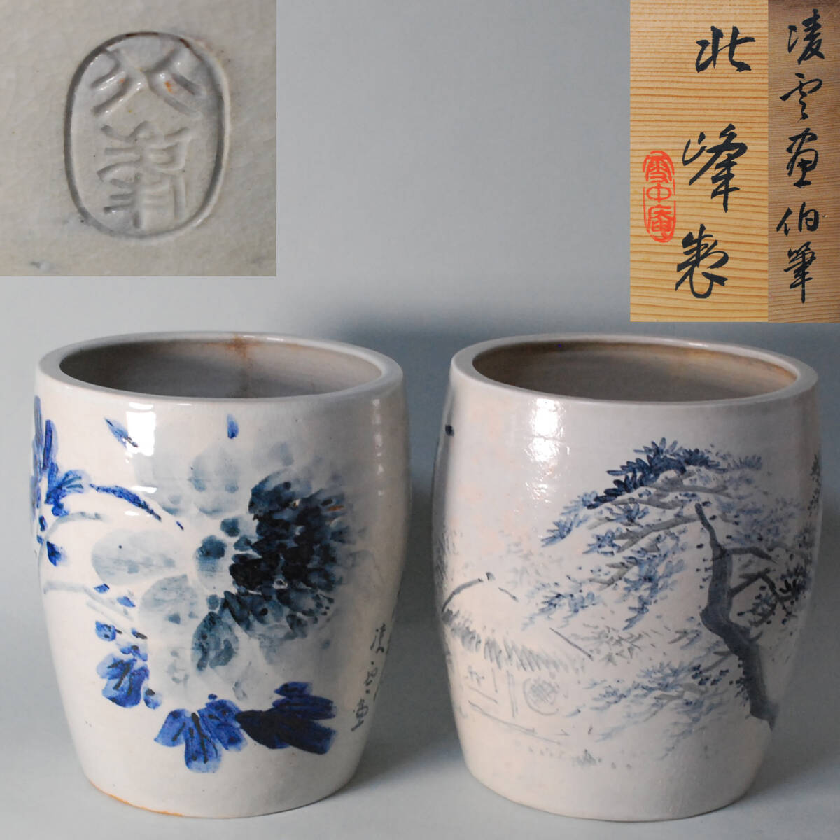 雪中庵 北峯製 染付 火鉢 渡瀬凌雲 絵付け 大丸北峰 瓶掛け 鉄瓶 五徳 火入 手あぶり 釜 メダカ鉢 鉢 共箱 北峰 B12