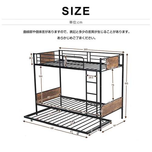 • サイズ 外寸:196長さ×97幅×163高さcm 上段:ベッド部内寸:196cm 下段:ベッド部内寸:195cm 支柱の太さ:直径38mm 重量 約47kg 耐荷重 1段あたり約120kg 素材 スチール(塗装仕上げ) 天板: MDF板(中密度繊維版)
