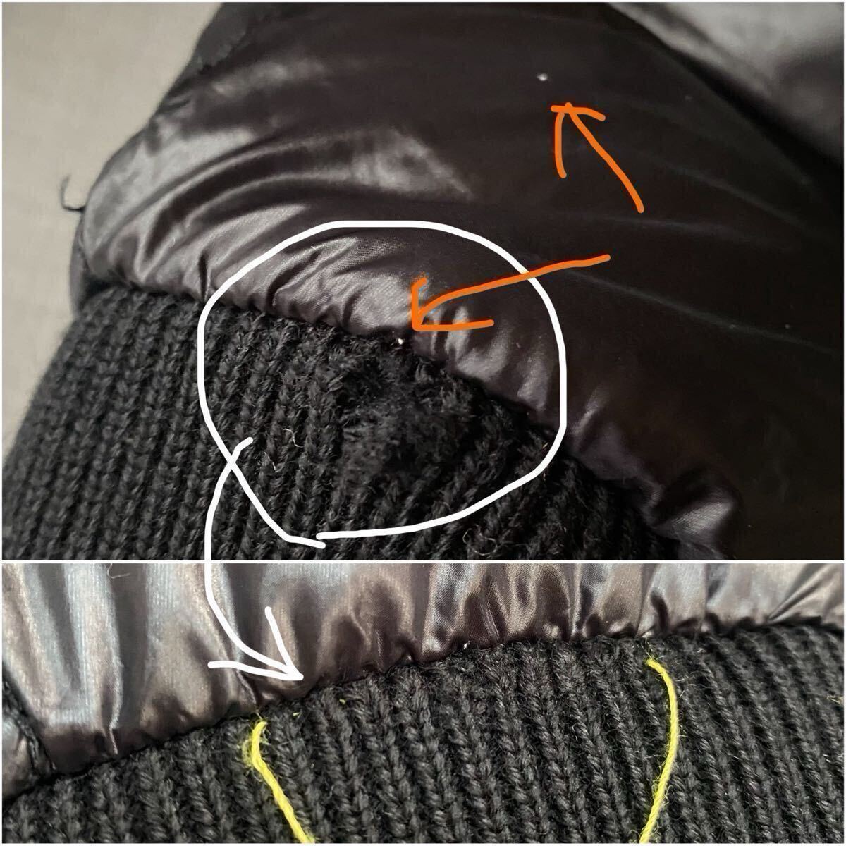 肘付近の擦れ(穴、糸切れ)、袖口の穴数箇所(ニット部分に関しては目立たないように補修しております)その他ファスナーの巻き込みによる小さな穴、汚れやファスナー付近のヤケ(色褪せ?)等見られます。