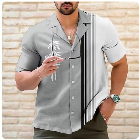 男女兼用半袖ボタン付きハワイアンTシャツ、ココナッツストライプ、カラー:グレー&ホワイト