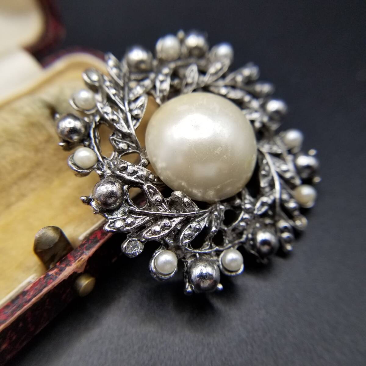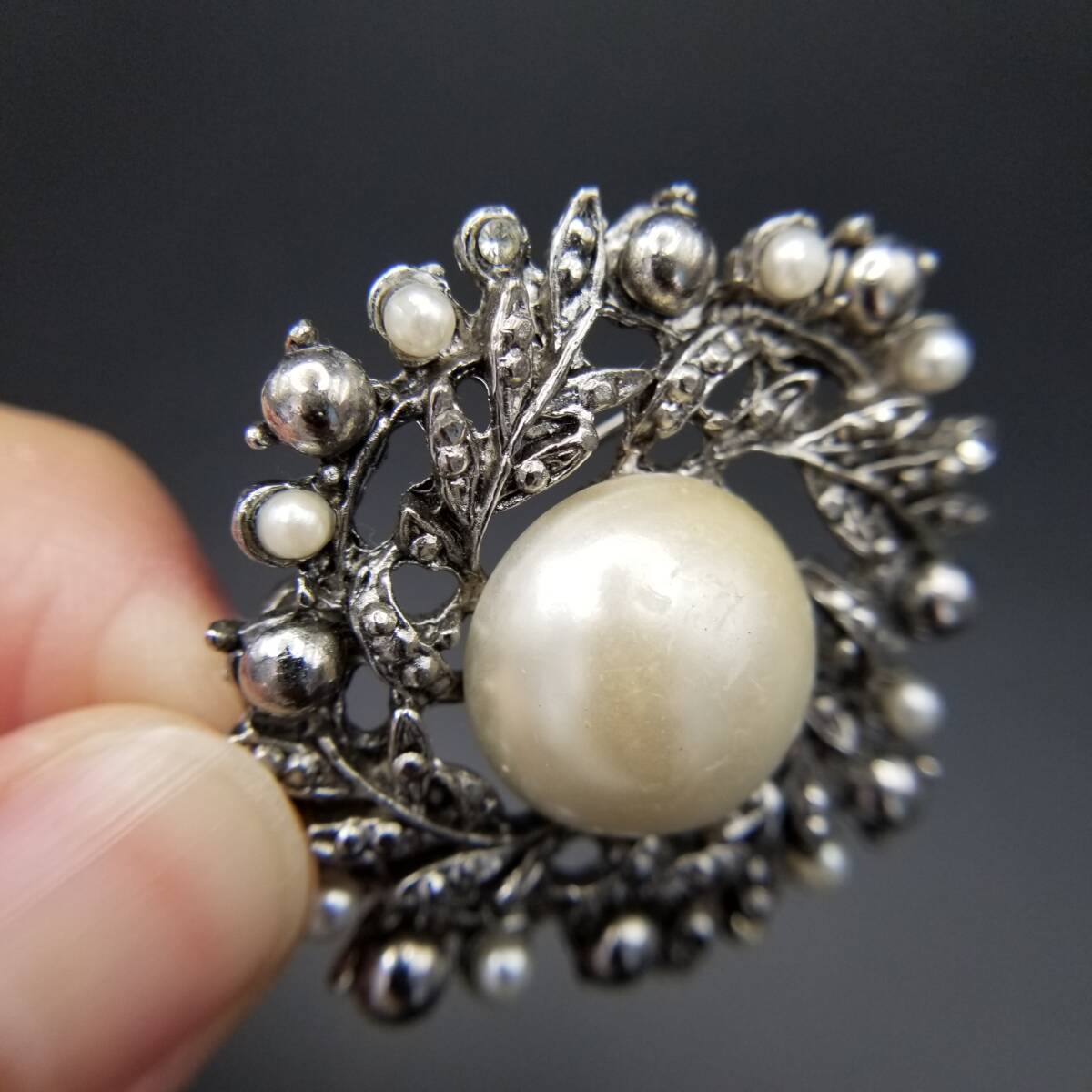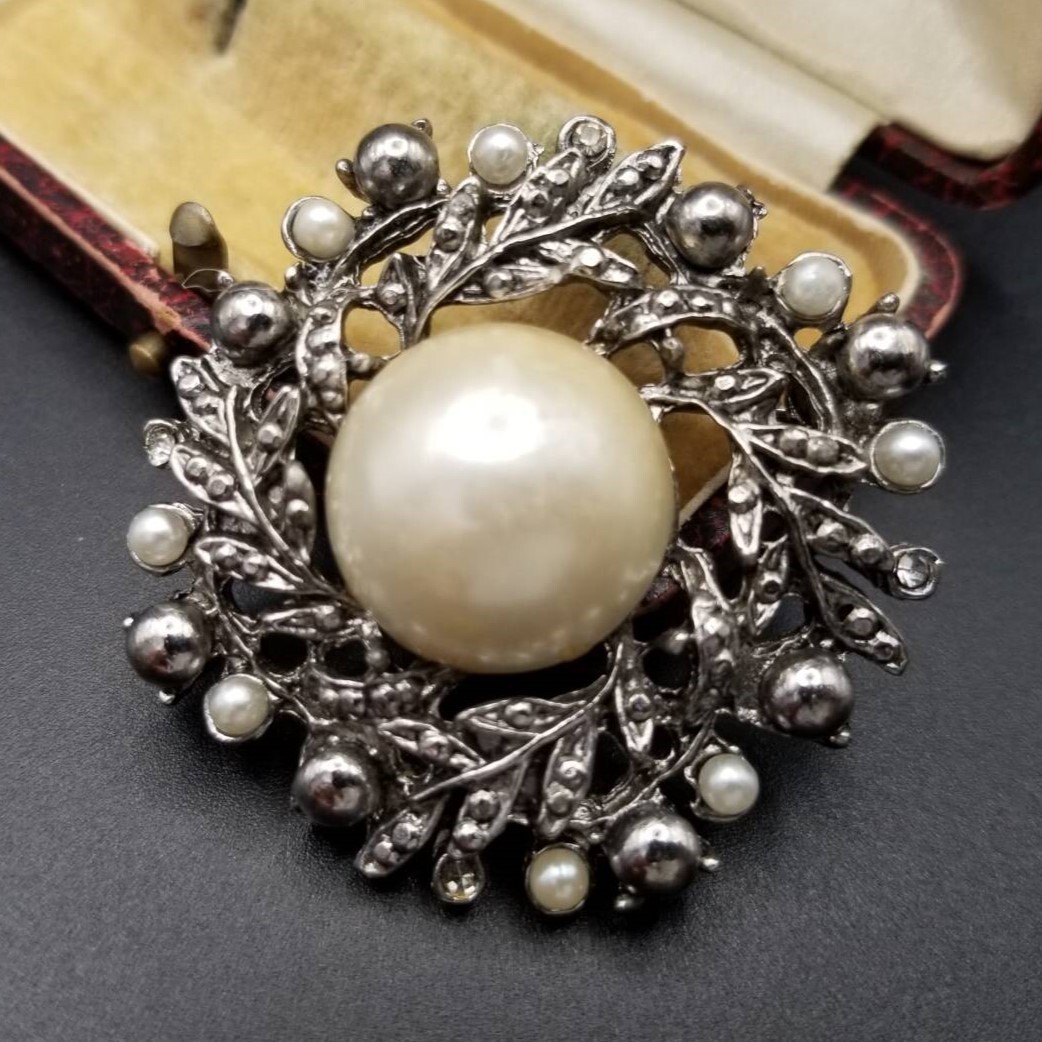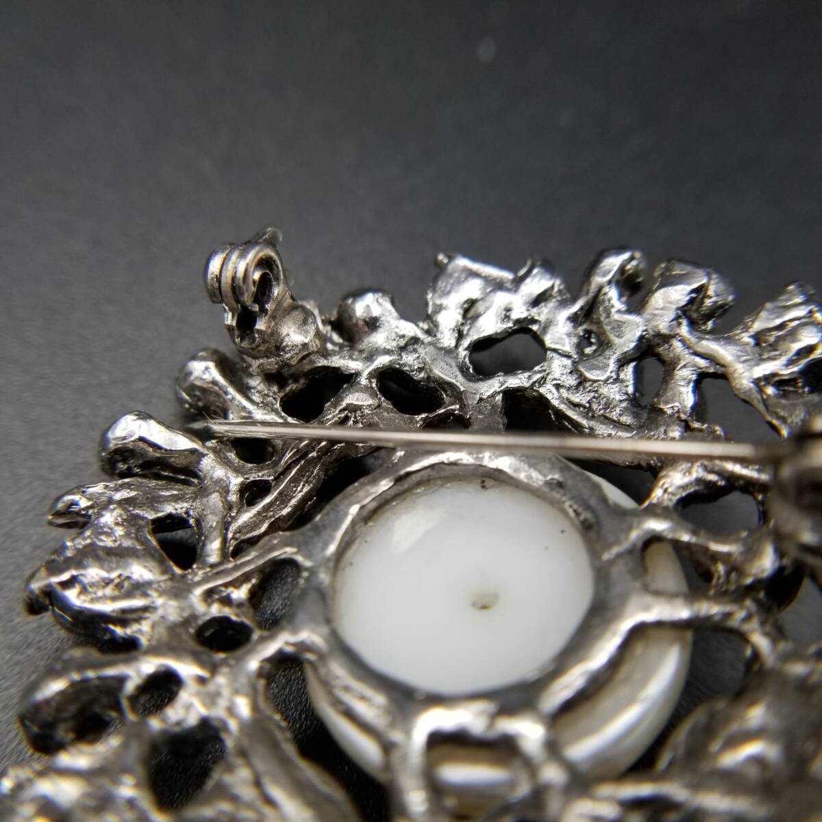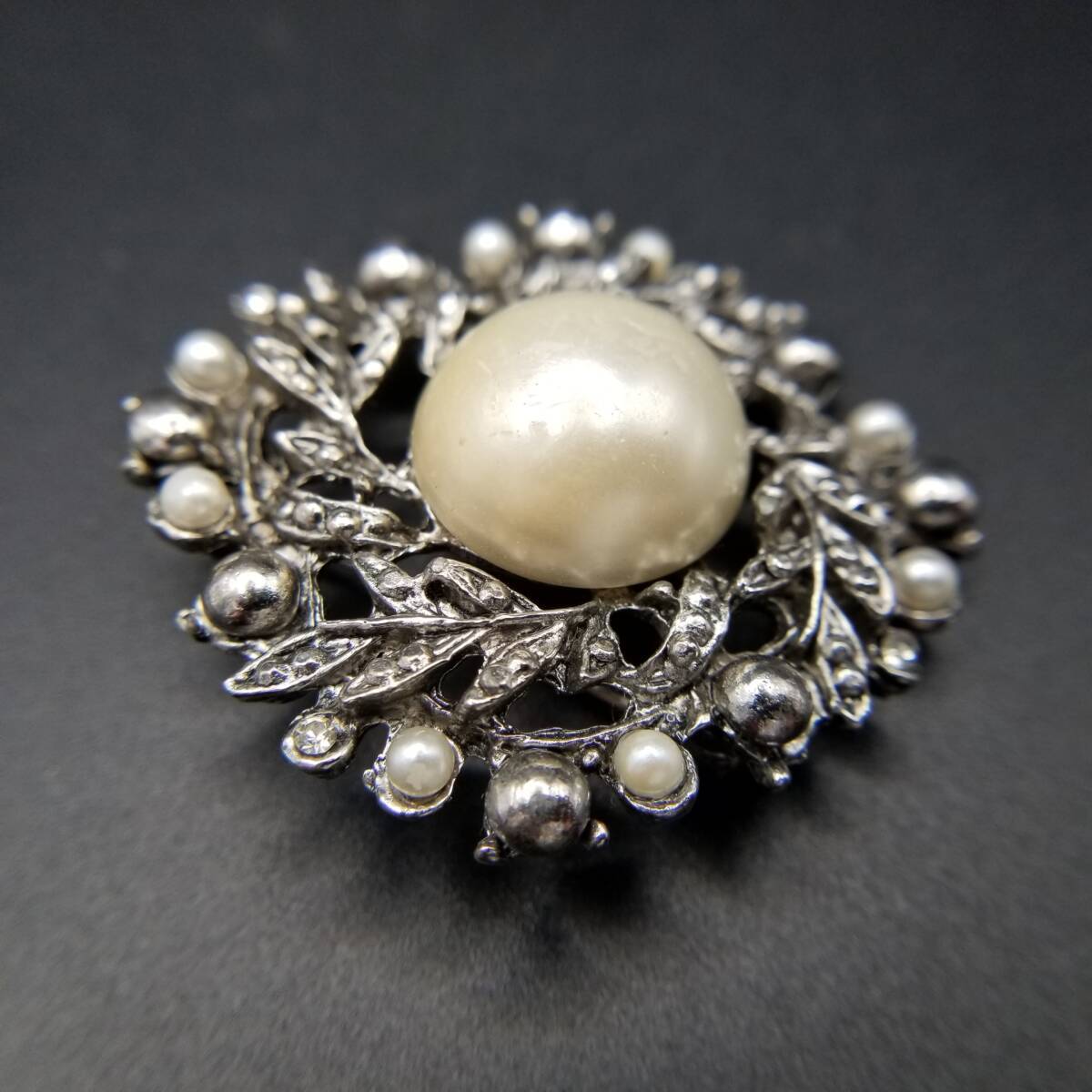 フローラル リース 植物フレーム パール調 ヴィンテージ フラワー ブローチ シルバートーン エレガント コスチュームジュエリー Y20-T
