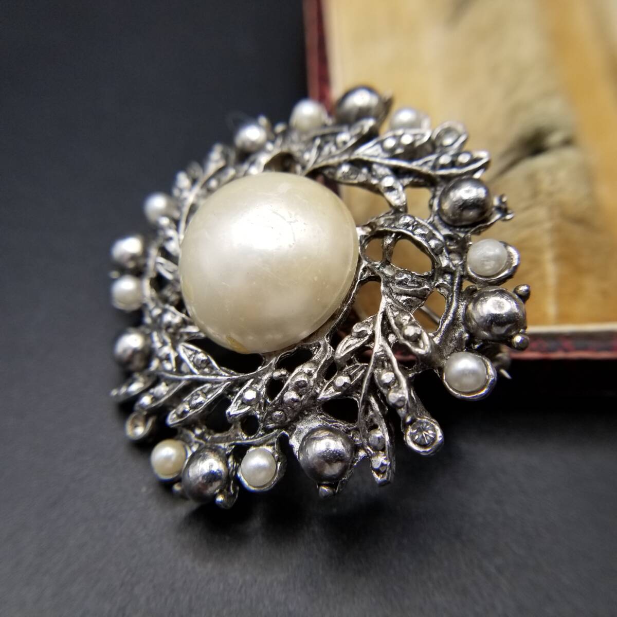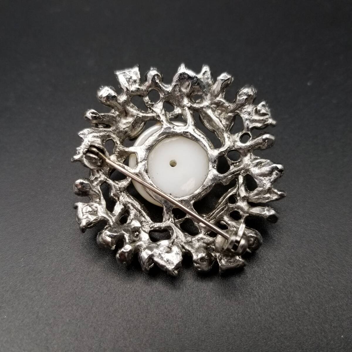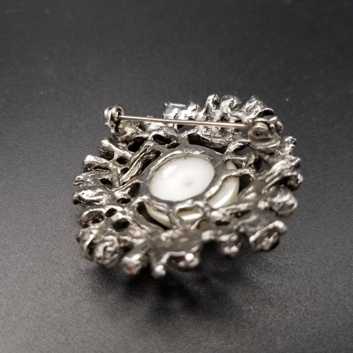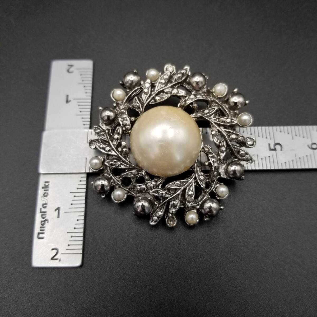フローラル リース 植物フレーム パール調 ヴィンテージ フラワー ブローチ シルバートーン エレガント コスチュームジュエリー Y20-T