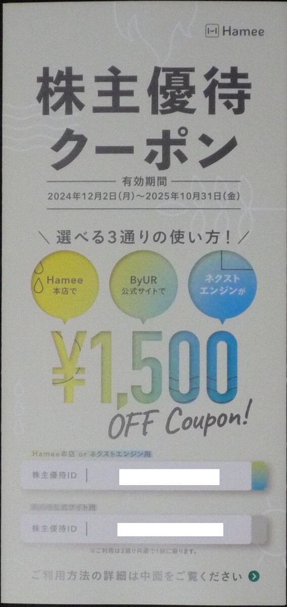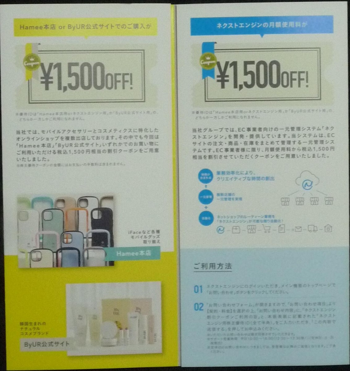 ■Hamee㈱の株主優クーポン1,500円相当です。