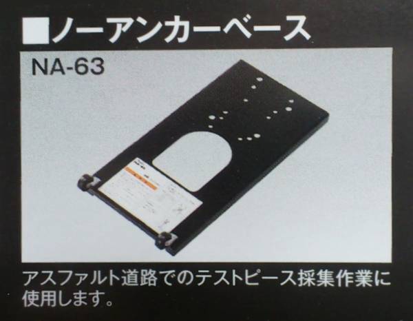 ![]() | 《使用方法》 ① ポールベースをレベルボルトとロックナットを2箇所使用して ノーアンカーベースに取付けます。 ② 左図のように体重を利用して穴あけを行います。 《警告》 ① 作業前にコアドリルの取扱説明書をよく読み、コアドリルの 使用方法を十分理解した上で作業開始してください。 ② 回転中のコアビットに巻込まれるような、だぶだぶの衣服を 着用して作業しないでください。 ③ アスファルト専用ですので、アスファルト以外への穴あけには 使用しないでください。 ④ 必ず両足で体重をかけて作業を行ってください。 ⑤ ノーアンカーベースが浮上がる程の無理な切込みは、絶対に しないでください。 ⑥ 急斜面では使用しないでください。