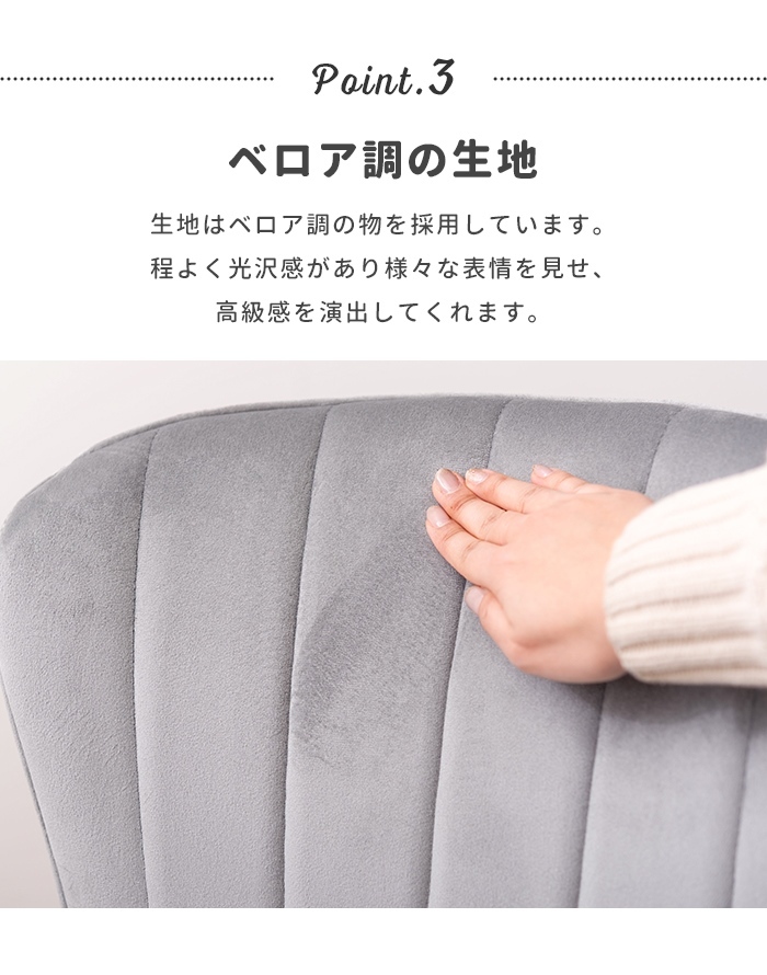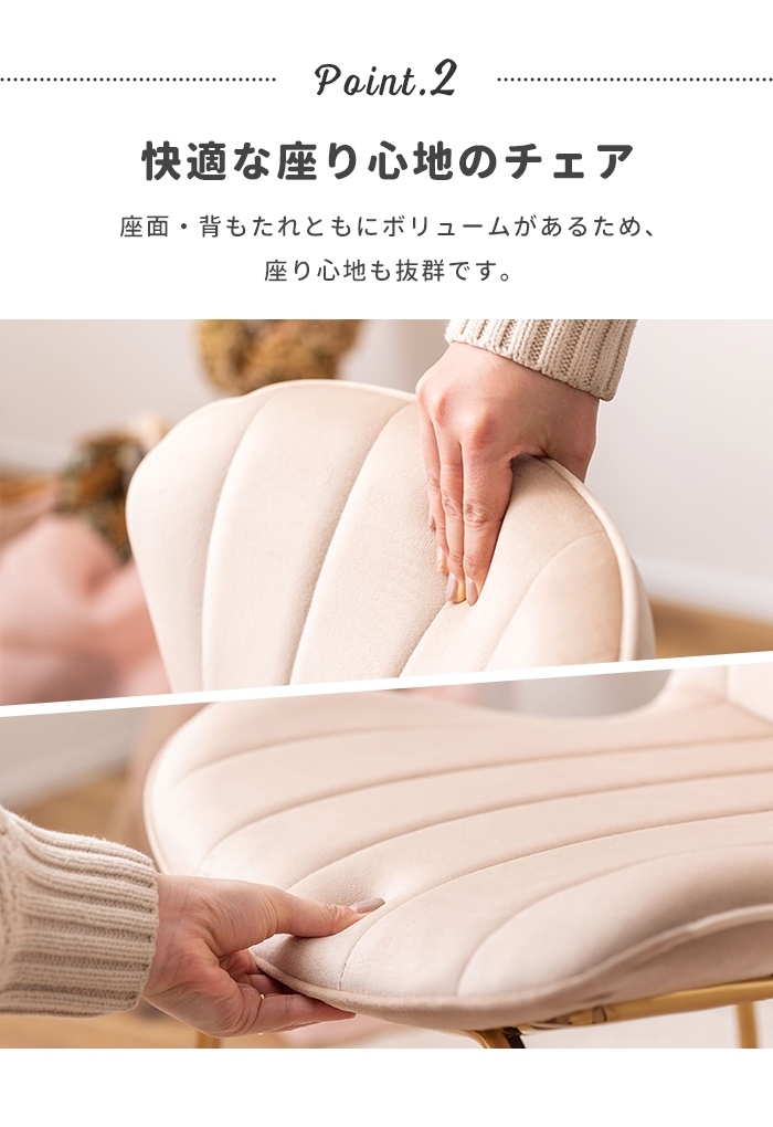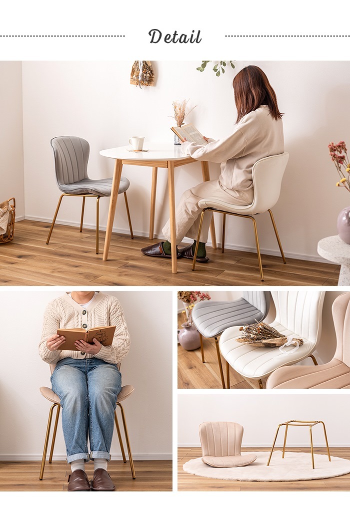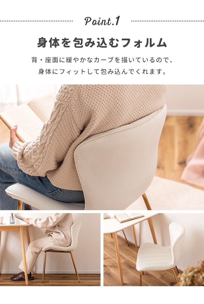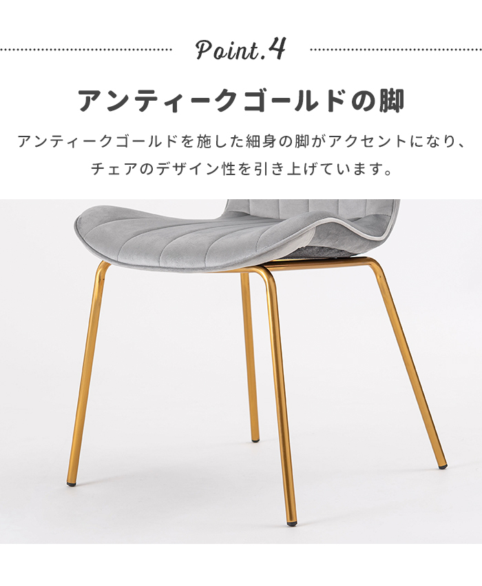 | ベロア調の生地×アンティークゴールド脚の組合せが、ガーリーでトレンド感のある雰囲気を演出。 身体を包み込むようなフォルムで、デザイン性にプラスして使いやすさにもとことんこだわりました。 背・座面共に緩やかなカーブを描いているので、身体にフィットして包み込んでくれます。 背面も座面も弾力があり、クッション性もある作りになっているので、座り心地も抜群。 生地はベロア調の物を採用。程よく光沢感があり様々な表情を見せ高級感を演出。 アンティークゴールドを施した細身の脚がアクセントになり、チェアのデザイン性を引き上げています。 |