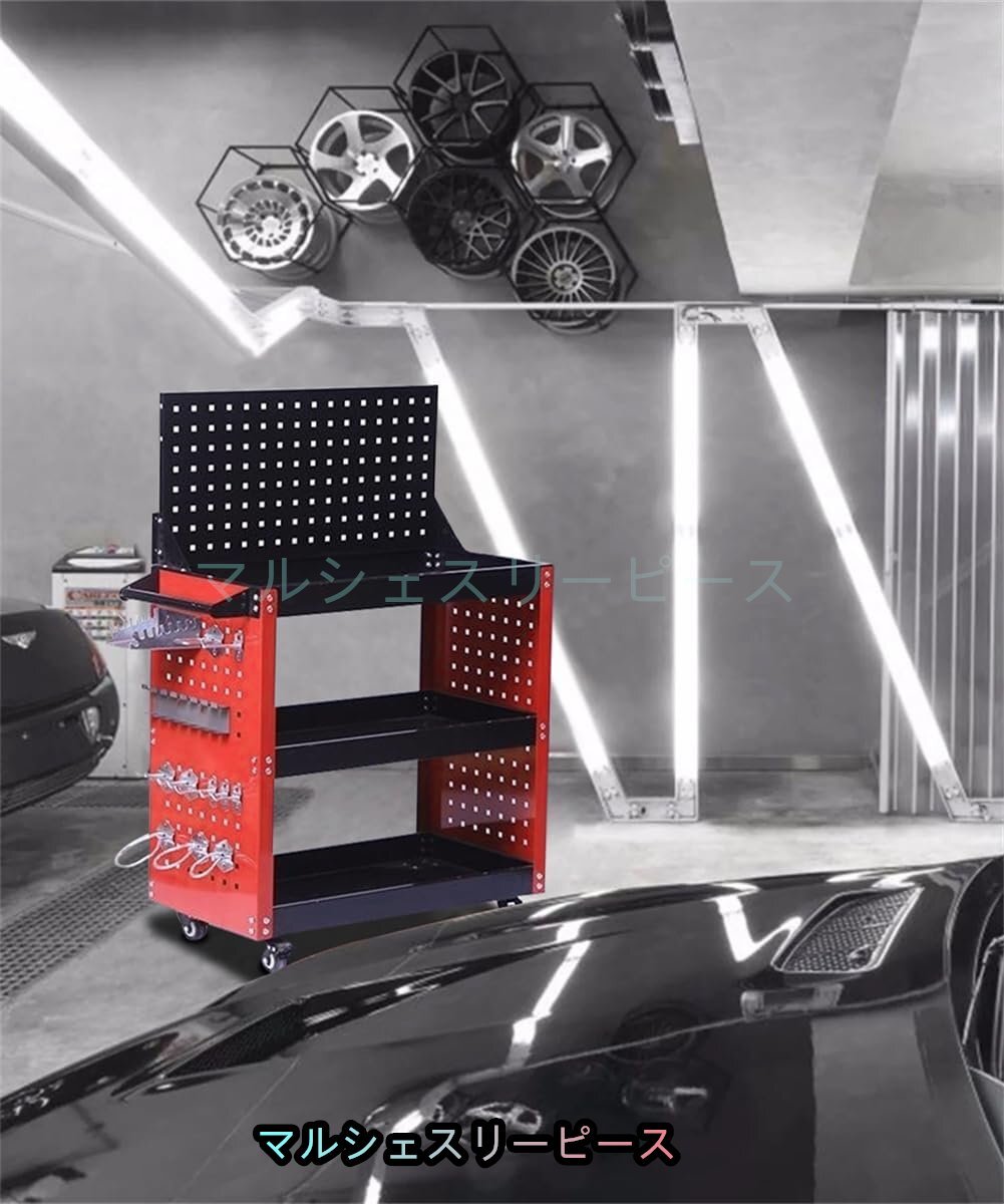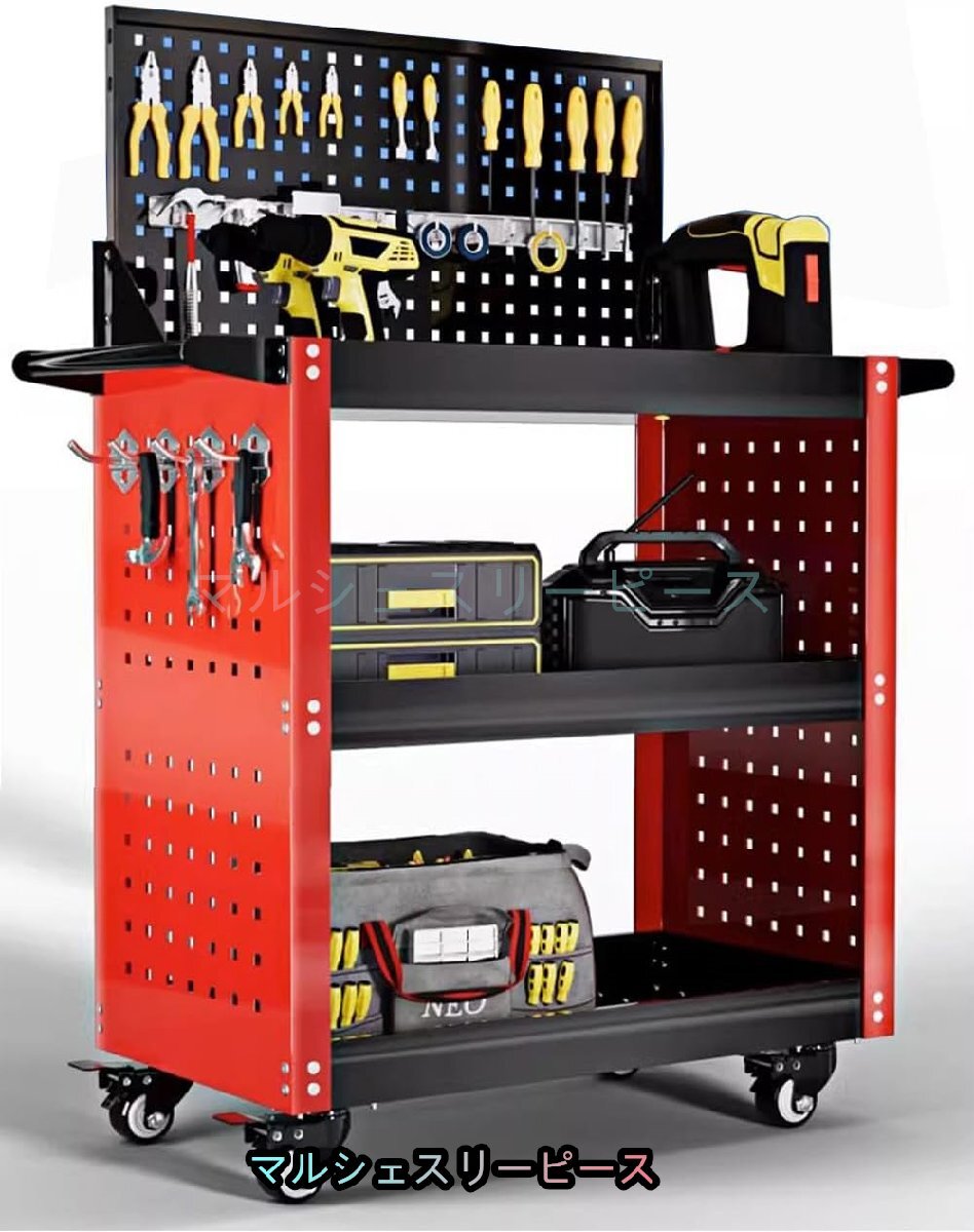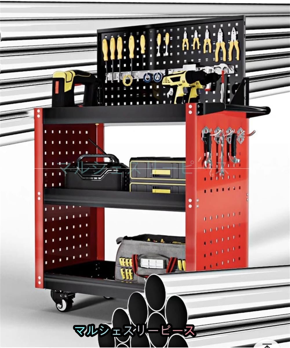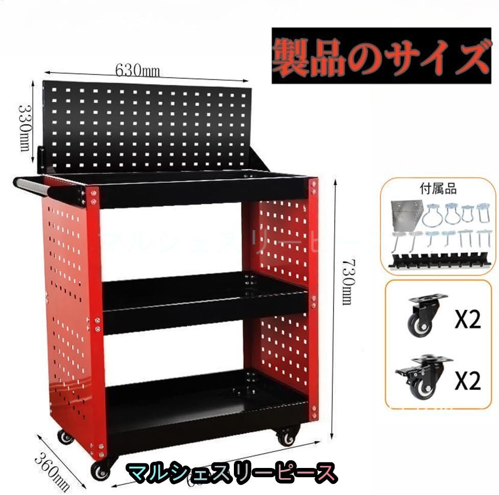 工具台車 ツールカート 360°回転 キャスター付き 3段 メッシュパネル付き 工具収納 移動 運搬 作業 ガレージ 倉庫 修理工場用 レッド