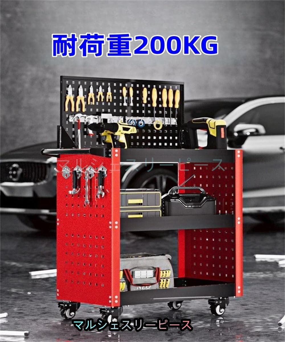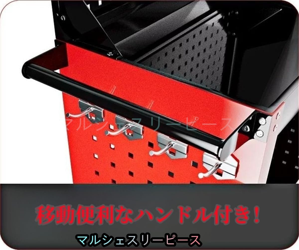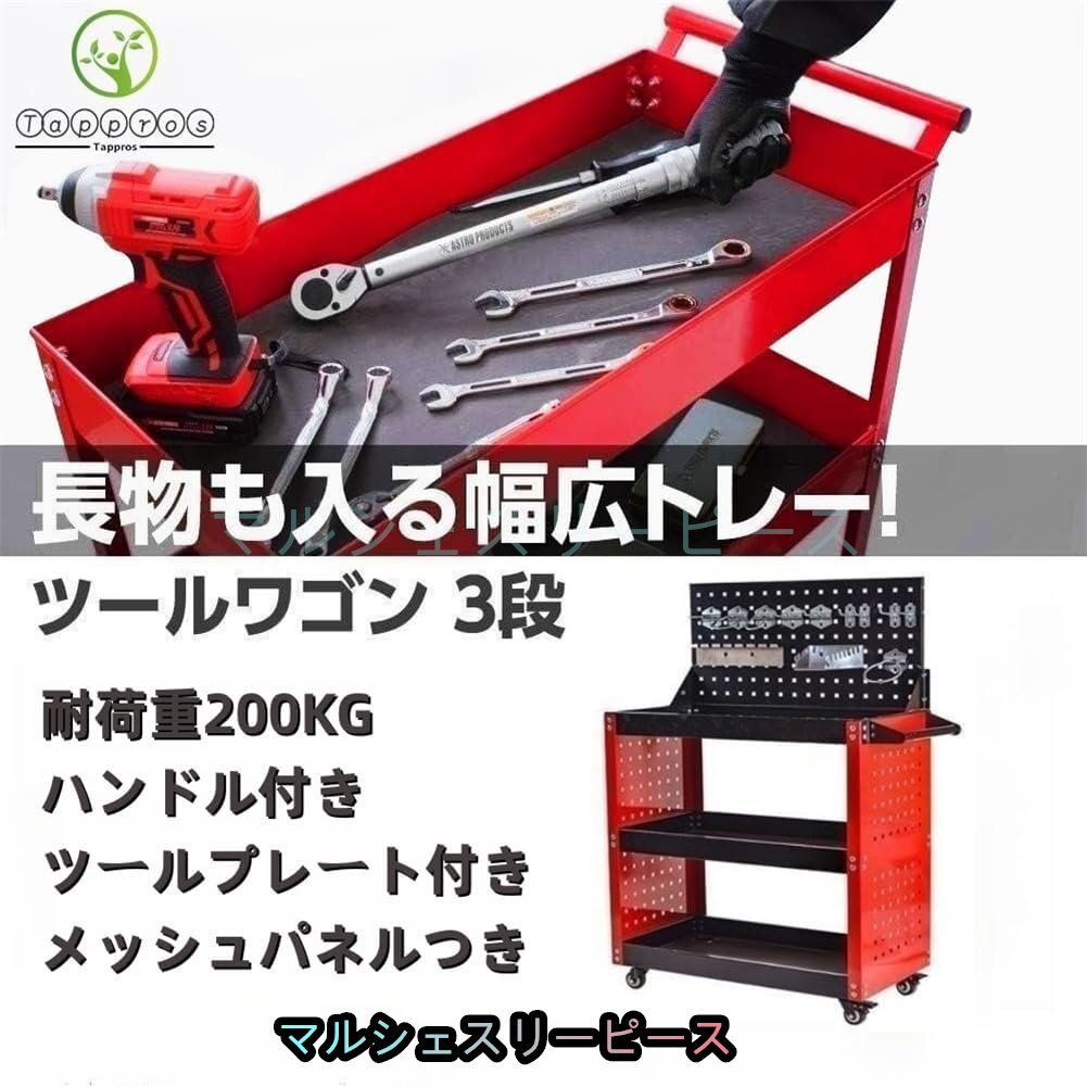 工具台車 ツールカート 360°回転 キャスター付き 3段 メッシュパネル付き 工具収納 移動 運搬 作業 ガレージ 倉庫 修理工場用 レッド