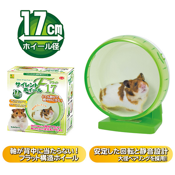 【送料・配送対応可能区分】同梱可※沖縄・離島は別途中継料がかかります。【商品詳細】大径ベアリングシステムを採用した、とっても静かなホイール軸が背中に当たらず、奥行きも広く足元もフラット!ゴールデンハムスター等の小動物に対応【サイズ】横約170×奥行き約100×高さ約212mm(最大値)【ホイール径】約17cm【付属品】スタンド1個、キスゴム1個【対象生体】ゴールデンハムスター【メーカー】SANKO(三晃/サンコー)【納期の目安】店頭在庫有…3~4営業日で出荷店頭在庫無、卸先・メーカー取寄…約4~7営業日で出荷卸先・メーカー欠品…別途連絡複数店舗運営しております関係で、店舗在庫がなくなる場合ございます。その場合、卸先およびメーカー元から入荷次第の手配となります。必ず余裕をもってご注文いただきますようお願いいたします。ご落札前に!!必ず下記内容を御確認の上、ご落札をお願い致します。ご落札=商品ページの内容をご理解いただいているという判断の元お取引をさせて頂きます。 ■送料■ 【通常便】詳しくは送料をご確認ください。※沖縄を含む離島にお住まいの方は別途料金が必要です。※但し大型商品は同梱できない場合もございます。 【注意】 ・商品以外の展示物は付属しません。 ・表示色はモニター等の環境により、実際の色とは異なることがあります。 ・製品の価格および仕様は予告なく変更する場合があります。 ・天然素材を利用した商品は、商品寸法・重量・色・柄が異なる場合があります。 ・在庫がない場合は納期が3~10日程かかる場合がございます。納期に余裕を持ってご注文下さい。