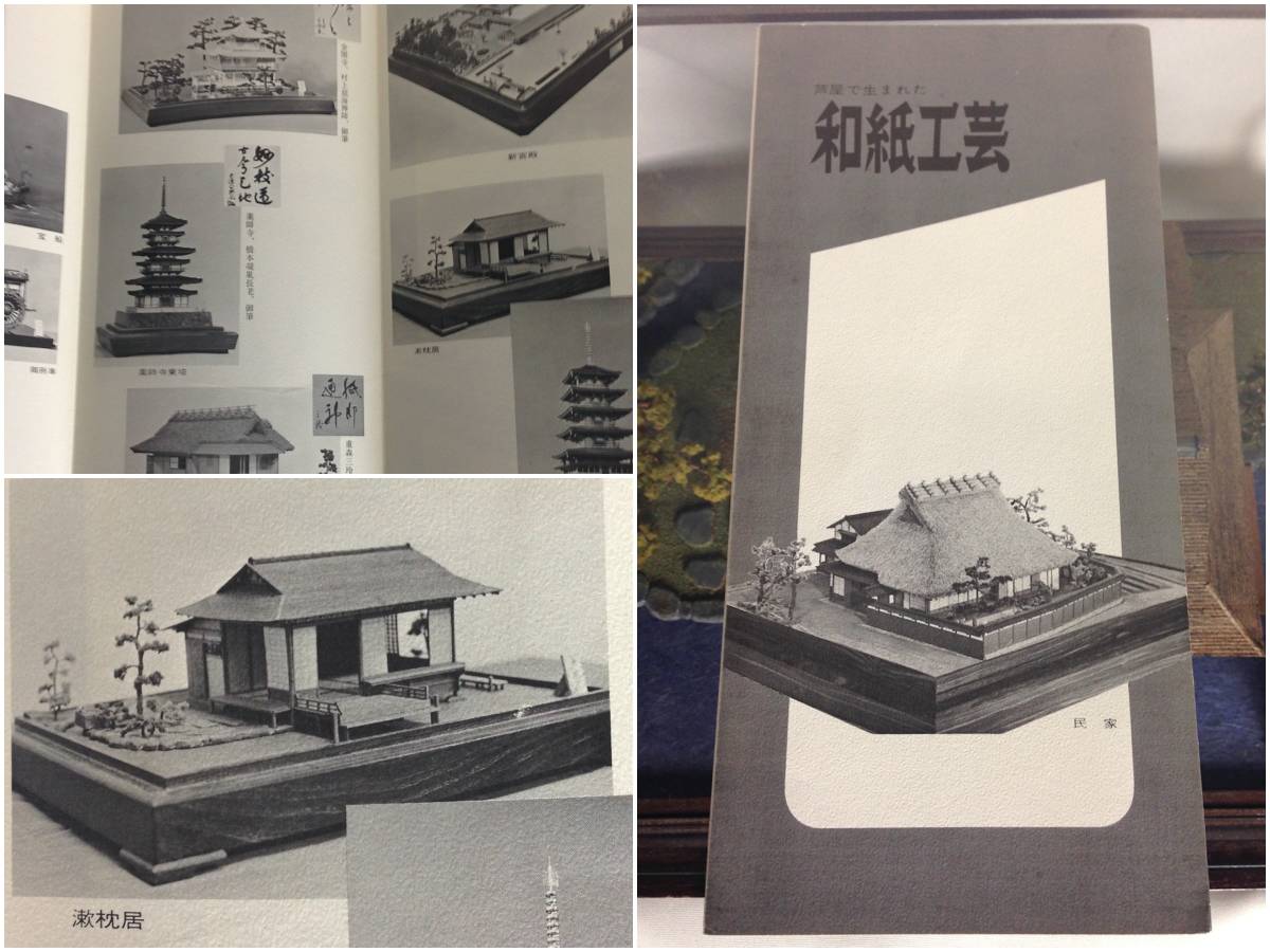 今から五十年以上前の貴重なお品です。和紙で緻密に造られた大変雰囲気のある模型で、画像8に記載されておりますように、作者の熱意が伝わる素晴らしい作品かと思います。内部もしっかり造られており、画像にはございませんが天井も再現されております。画像2・7の当時のカタログ的な冊子に掲載されている写真の漱枕居の模型が、こちらの模型と同一かと思います。画像10ではヤマネ工芸の作品が当時の首相より米大統領へ贈られていたそうです。他では探してもなかなか見つけられない希少なお品で、素材の拘りや造りから芸術性の高さが窺えるのではないかと思います。