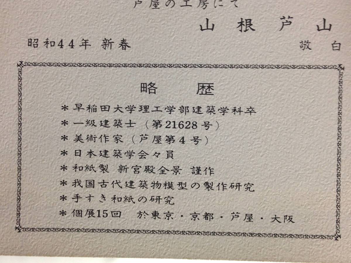 昭和37年に芦屋市にてヤマネ工芸(和紙工芸品制作)開設され、山根さんが芦山の号で活動されていました。*ヤマネ工芸さんは現在西宮で模型を造ってらっしゃる会社です。