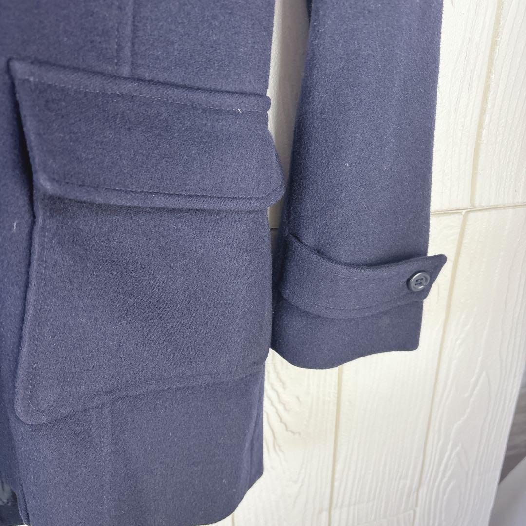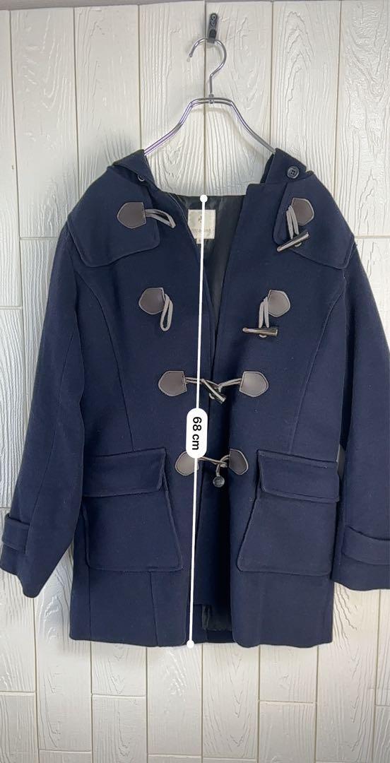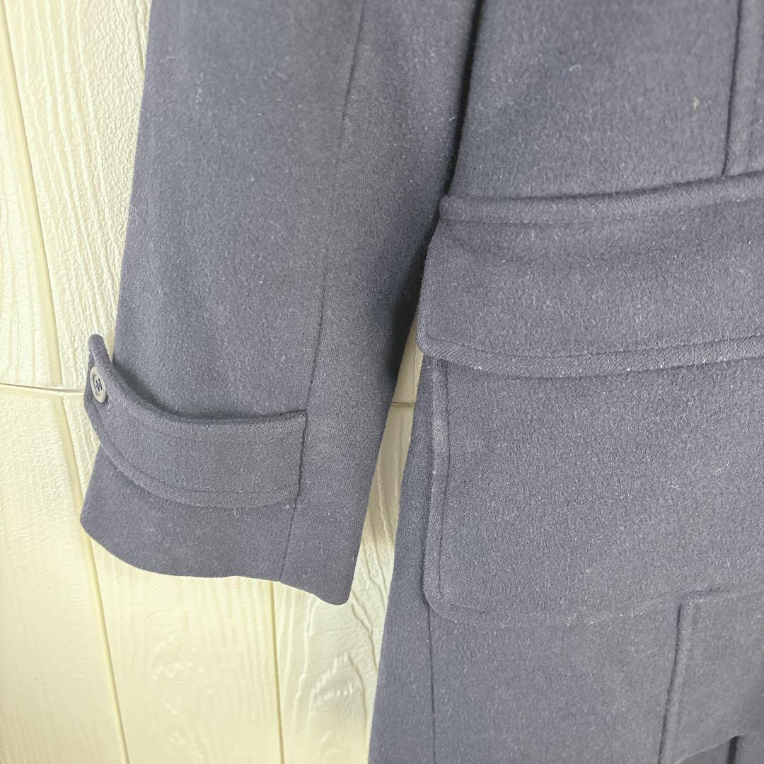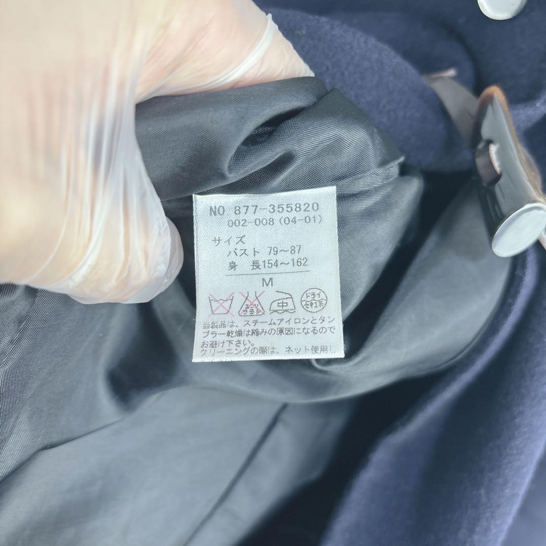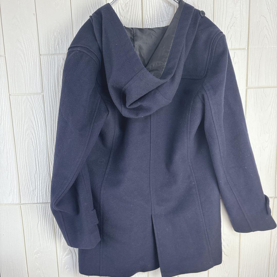 ネイビーのダッフルコート、Mサイズ、前面ポケット付き。