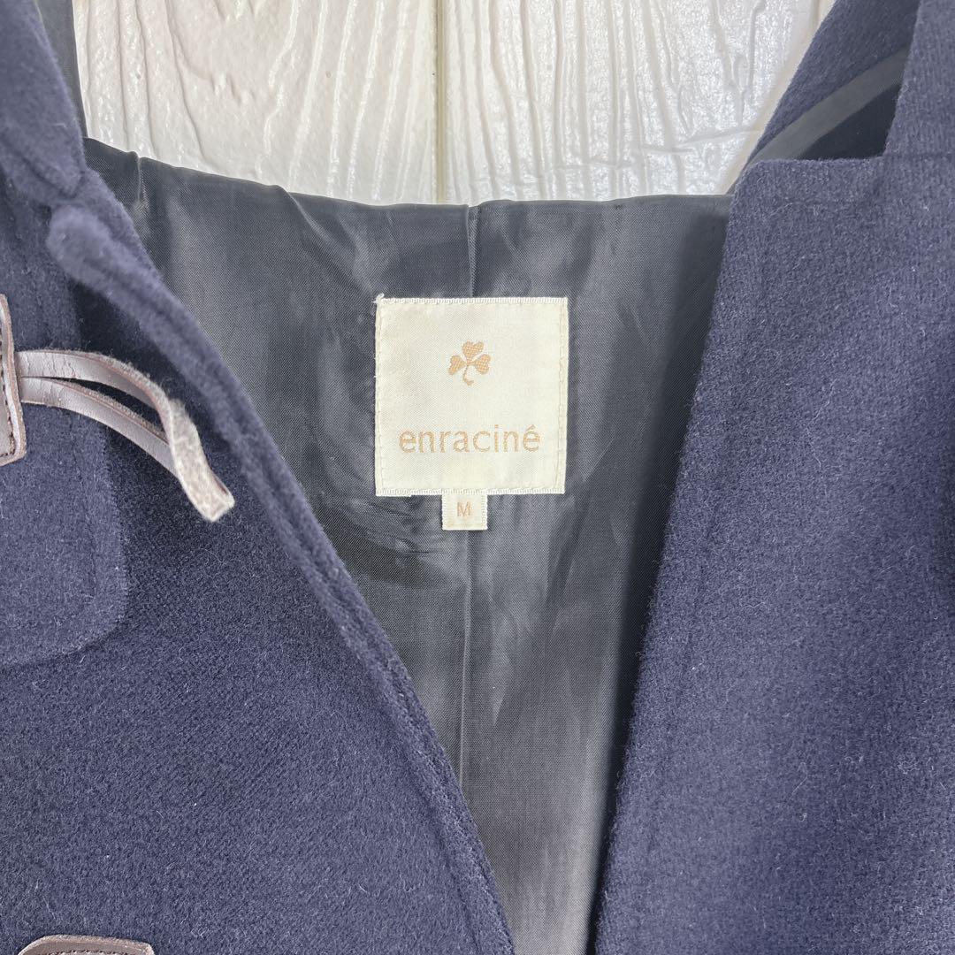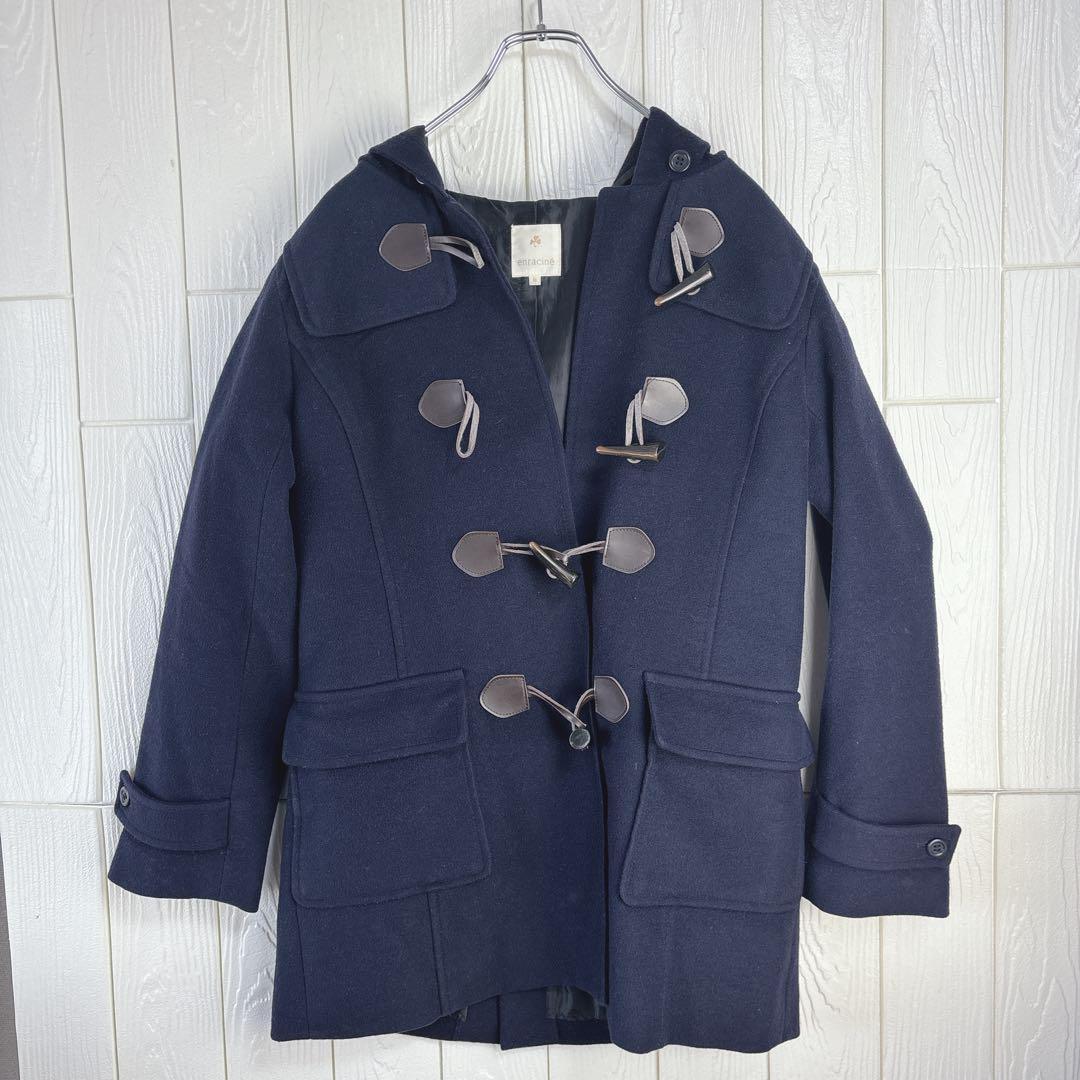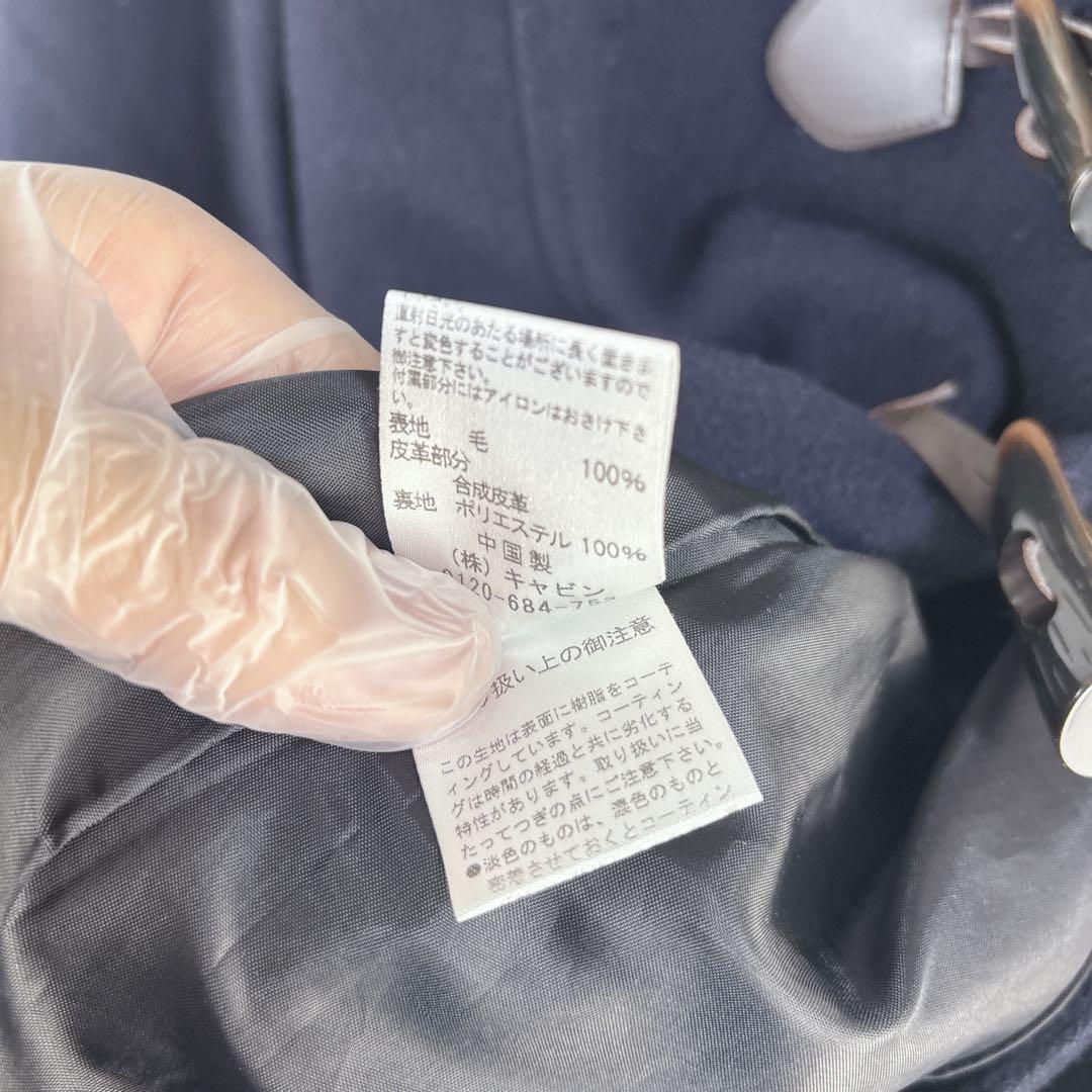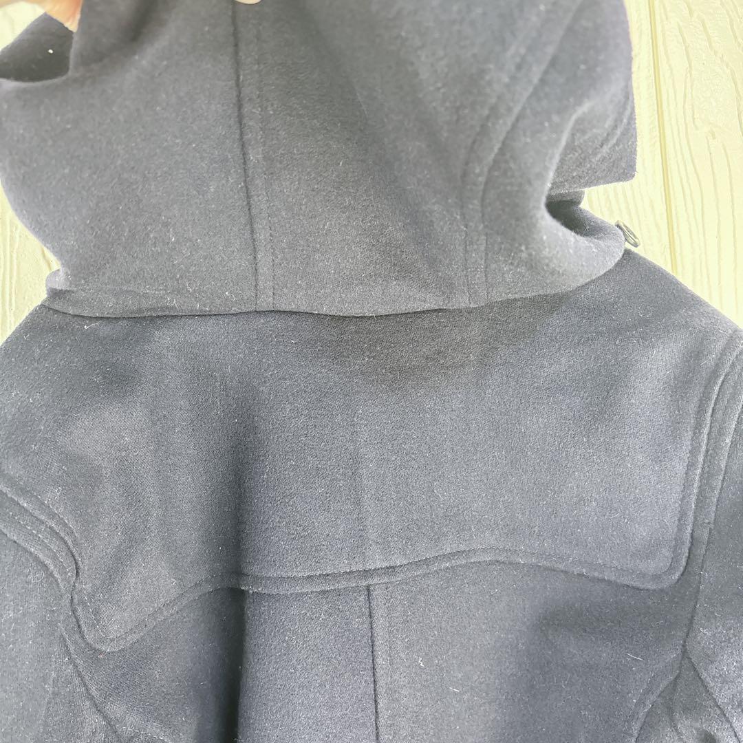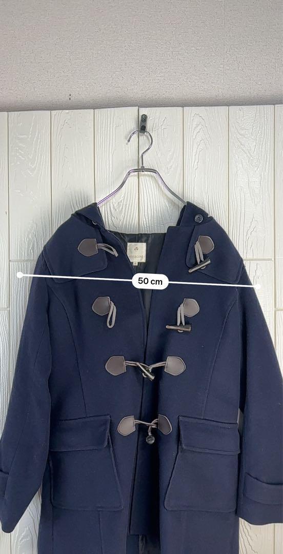 ネイビーのダッフルコート、Mサイズ、前面ポケット付き。