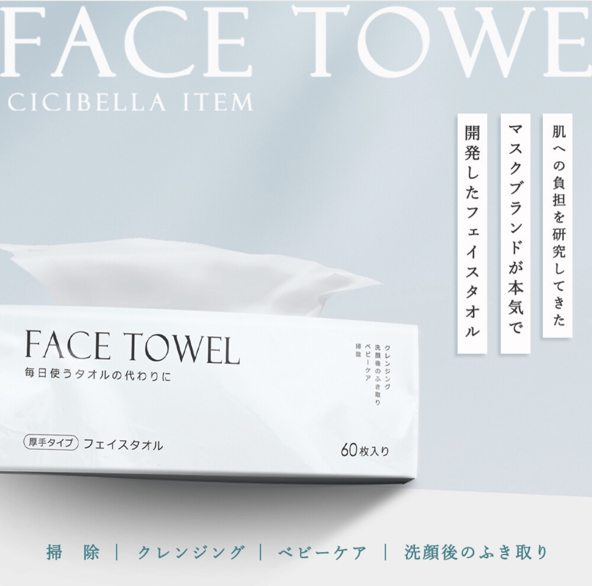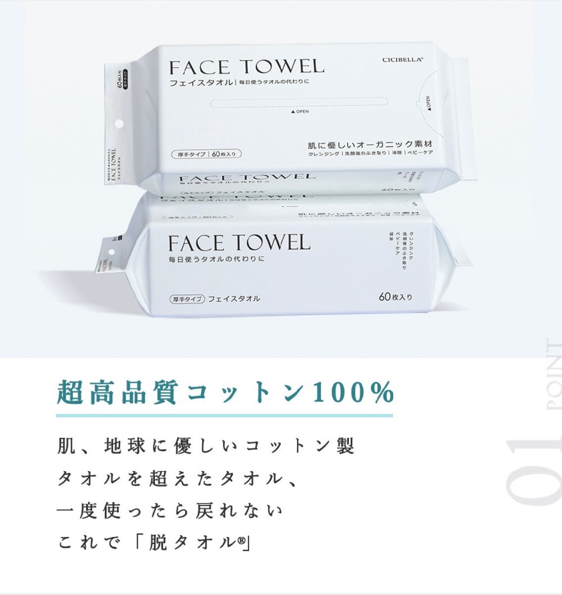 CICIBELLAフェイスタオル 【60枚入×8袋セット】美容のプロも愛用中!!!脱タオル!【敏感肌の方におすすめ!】綺麗に洗ったタオルにも菌が発生していることもあります。使い捨ての本製品は常に綺麗な物を使用できるので、菌による肌トラブルを防ぐことができます。本製品は100%コットン素材で吸水率がとてもいいので、洗顔後拭く際何度も顔をこする必要もなく、お肌にとても優しいです。【2WAYデザイン】置きたい場所によって使い分けができます。ティッシュのように置いて取り出せます。フックにかけて下から取り出すことも可能です。【用途は様々】本製品は乾いたままでも濡らしても使用できます。・洗顔後のふき取り・クレンジング・パック・ネイルオフ・掃除・ベビーケア等、人それぞれ色々な使い方をしていただけます。パッケージ変更のため、画像と実物のパッケージが違います。