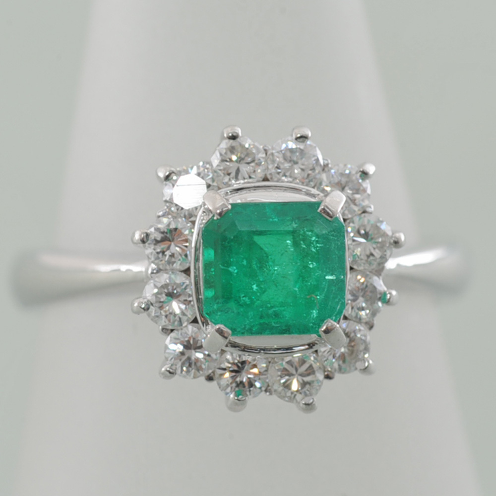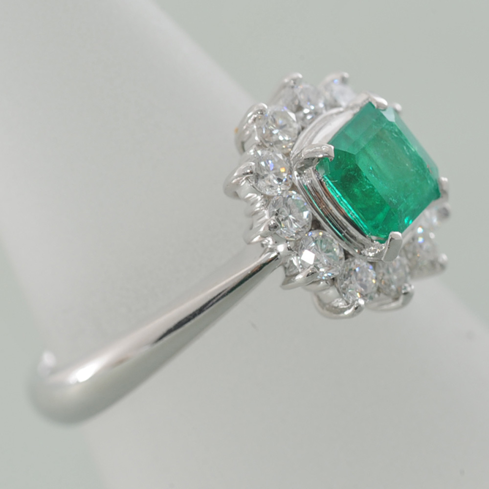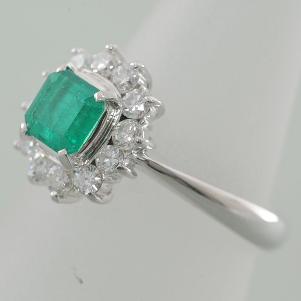 ● 材質:プラチナ900、エメラルド1石(スクエアエメラルドカット)、取り巻きダイヤ12石