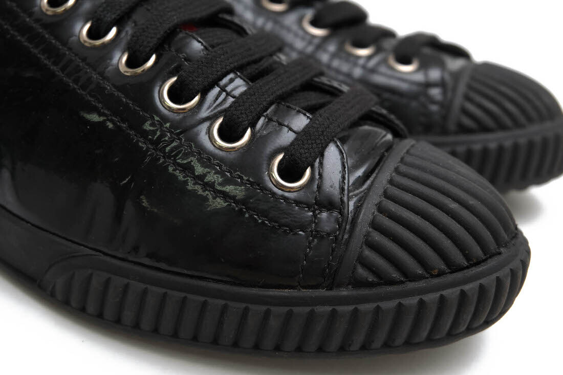 | 光沢のあるパテントレザーを使用した高級感溢れるデザインのPRADAのローカットスニーカー。フロントにはプラダ独特のブランドカラーを配したタブをデザイン。インソールに、お馴染みのレッドラバーロゴを配置したハイセンスなモデルです。 |