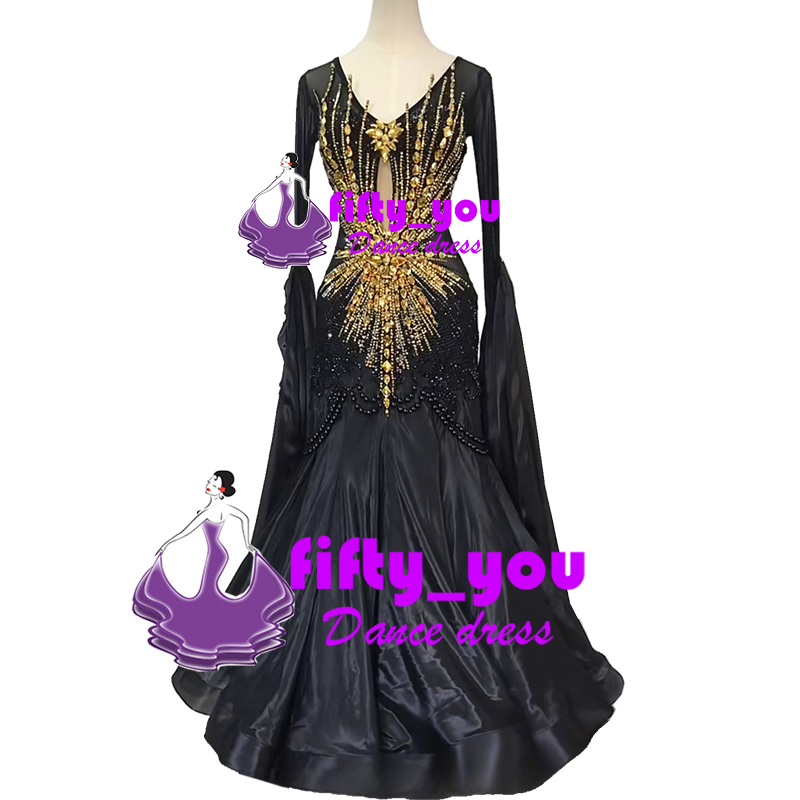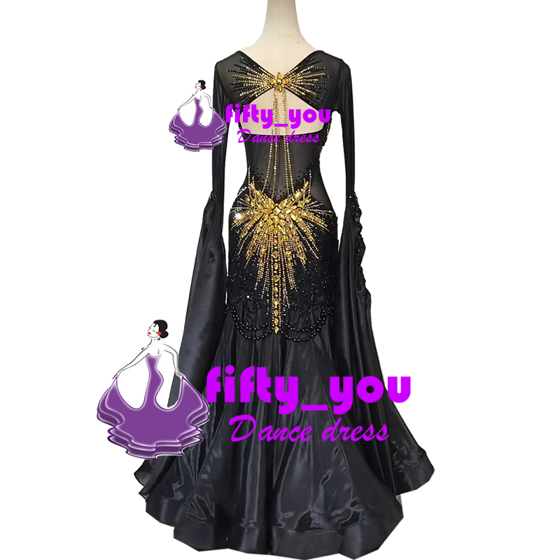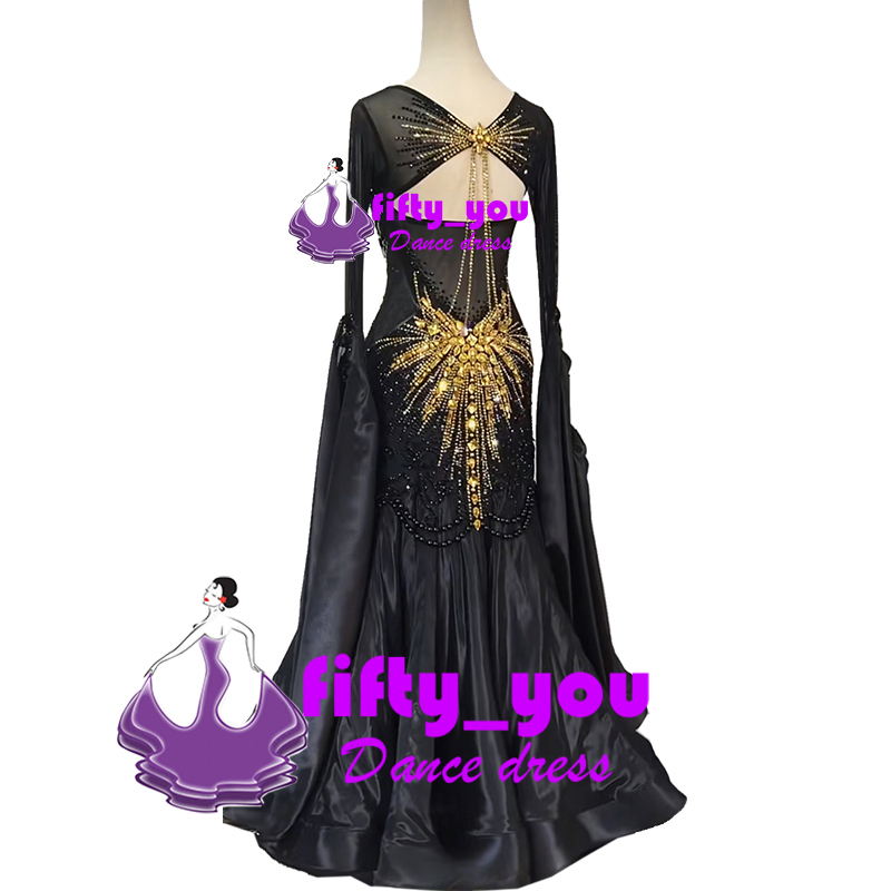 新品fifty_youレディース社交ダンス衣装 セミオーダー モダンドレス  スタンダードドレス  高級品 豪華ストーン飾り 黒色 パール飾り