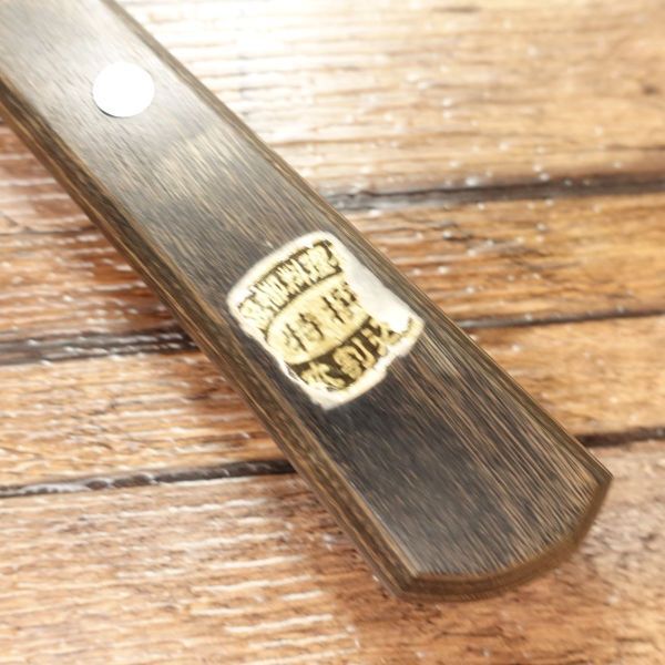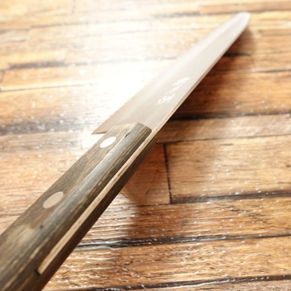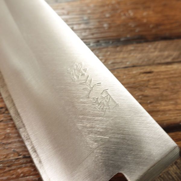 この包丁は両刃で、ハガネが割り込まれたお品で、切れ味抜群で比較的お手入れも楽ちんです。刃先はハガネですので水分はこまめにふき取ってお使いください。