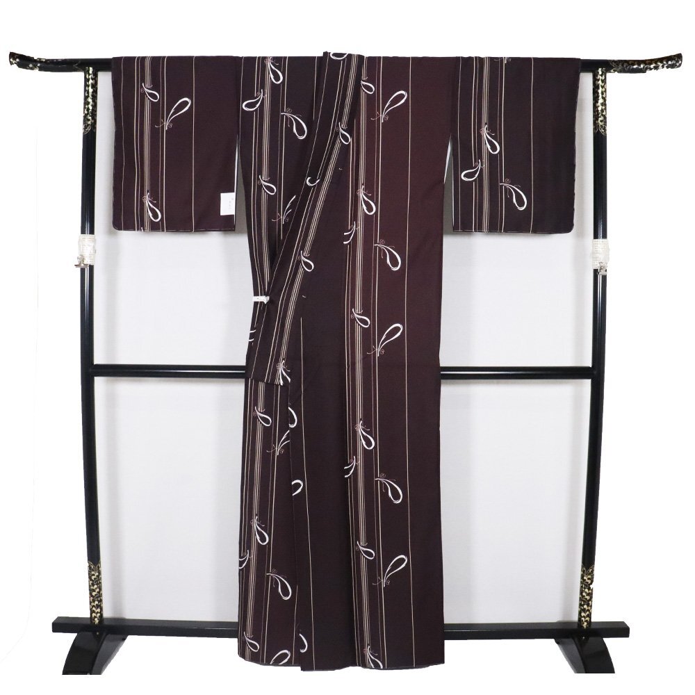 | 小紋 袷 赤茶紫地 リボン・縞 163 広襟 L寸 新品 仕付け付き |