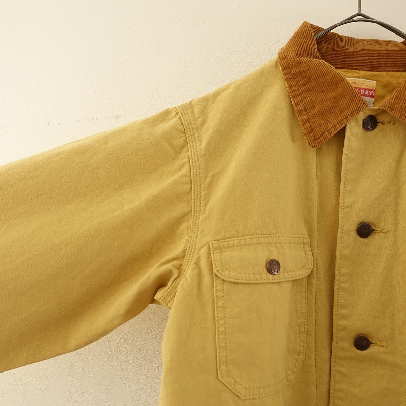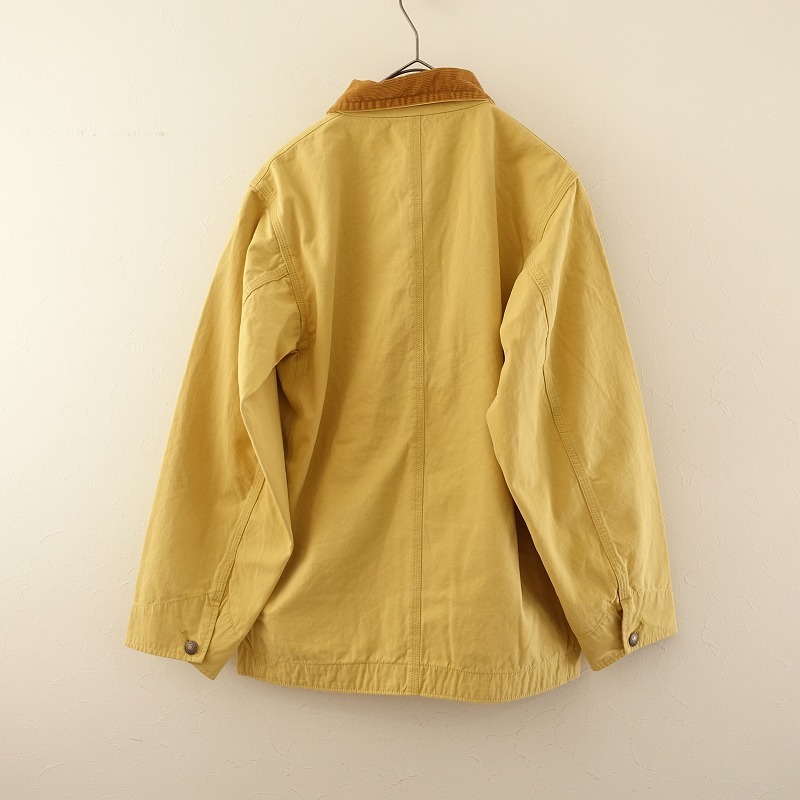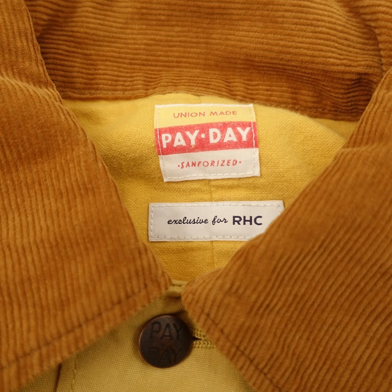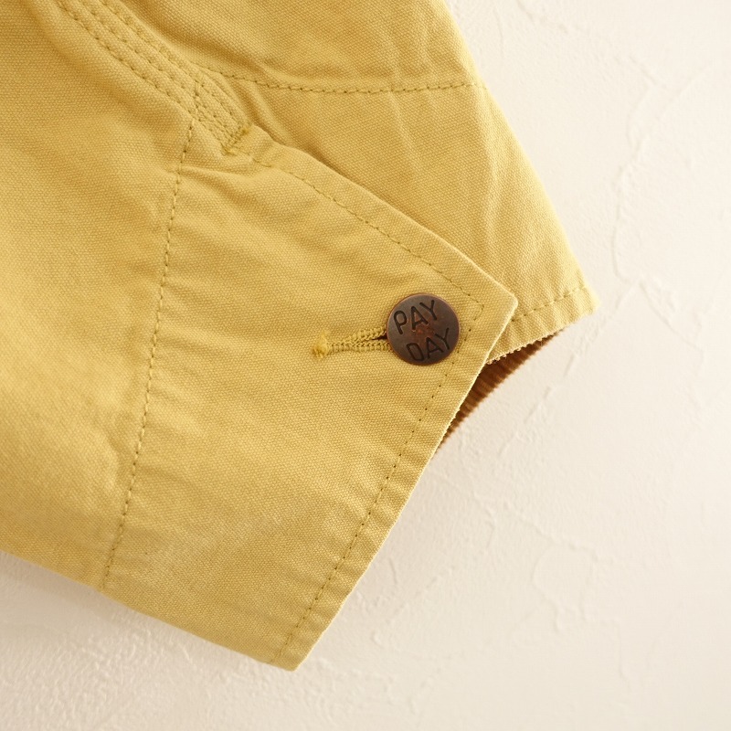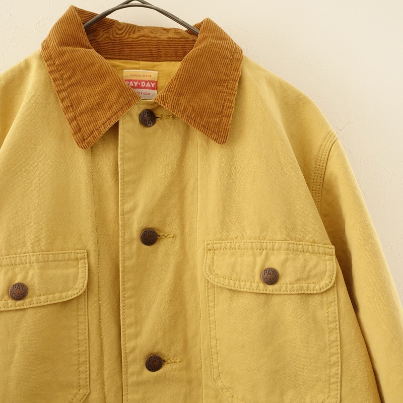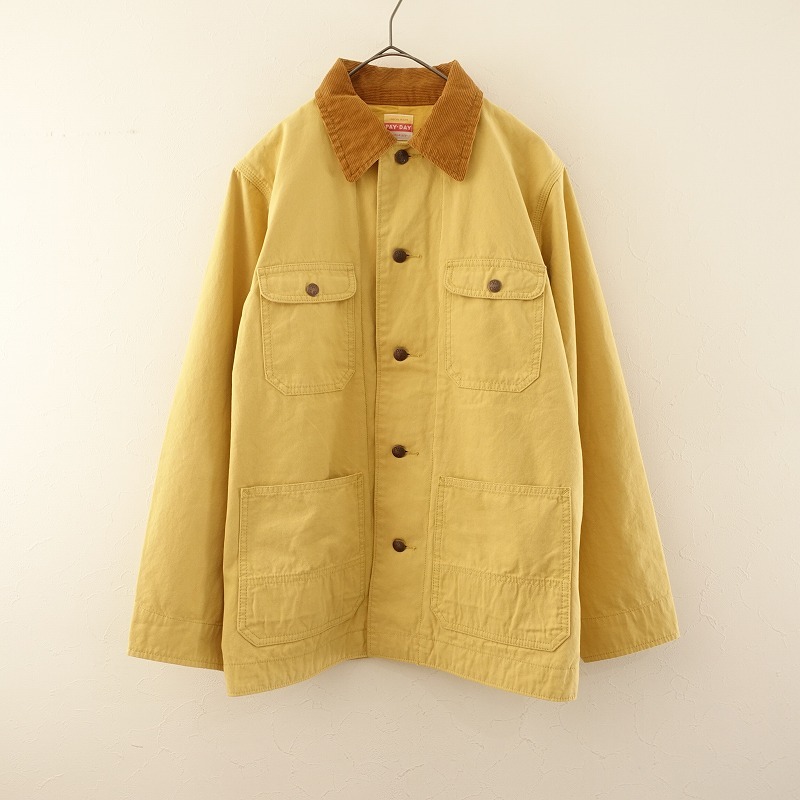 | PAYDAY×RHCのExclusive Coverall Jacketです。カラーは褪せ感のあるくすみイエローで、コットン素材です。襟&袖口内側にはブラウンのコーデュロイ地が重ねられており、フロント&袖口ボタンで着脱できます。フロントにポケットが4つあり、身頃のみ裏地付きです。定価(メーカー希望小売価格)36,300円の商品です。 |