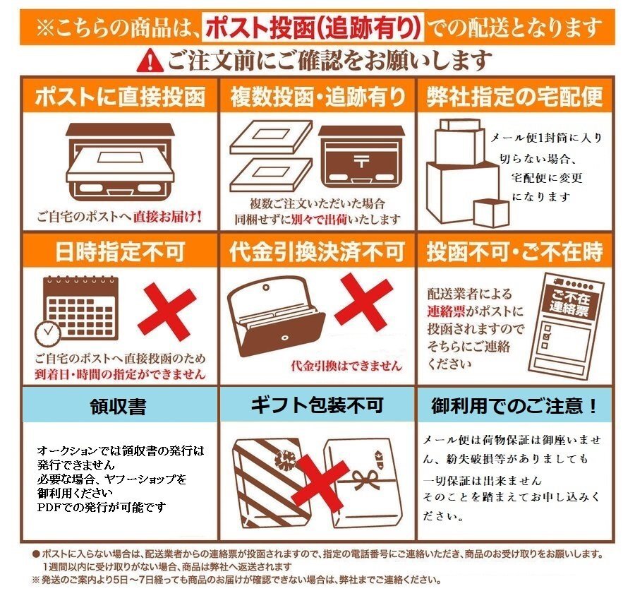 ●発送は『ご入金確認後』となります。通常1~2日で発送しております。 ●毎週日曜日、祝日はお休みを頂いております ●商品の配送は配送業者指定などの依頼は、お受け致しかねます。 ●領収書希望の場合、信書ですので宅配便には同梱できません、別途100円掛かります ●店頭でのお支払い・お受け渡しは致しかねます。 | ||