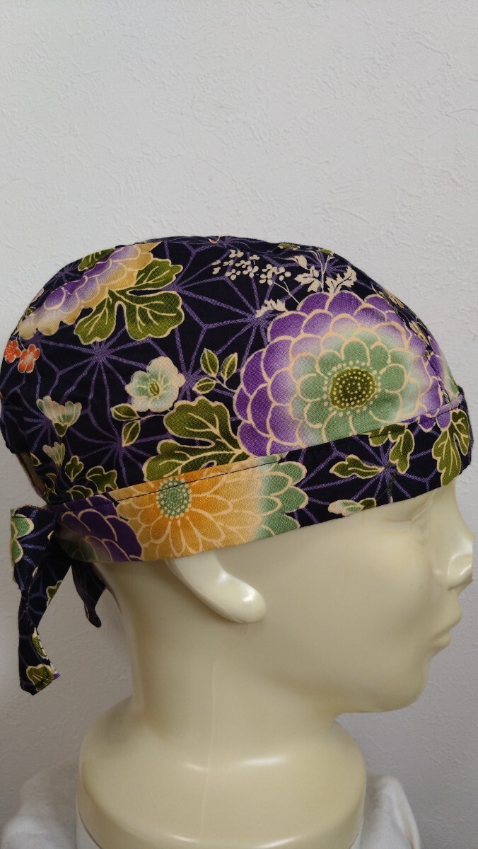 短★バンダナキャップ★ハンドメイド 和柄 花柄 花 菊 きく 紫