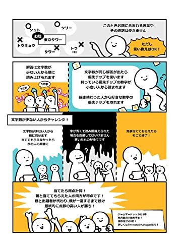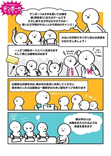 「角刈書店 ボードゲーム デンポー!! 4-8人」▼4580549516065▼(商品説明)・マルチカラー 初版・短い文字数で伝えるゲーム・なるべく短いヒントで伝えて高得点を得たい...けれども短すぎると伝わらない・大人数で遊べるパーティーゲーム! 盛り上がること間違いなし!・プレイヤー数: 4-8説明 商品紹介 あなたは秘密のお題を解答者に伝えたいデンポニスト。 ただし使える文字はカタカナのみ! 略語や直訳、お題を含む言葉は使えません!! 文字数が少ない人から順番に解答のチャンス が与えられるのでなるべく少ない文字数の言葉を 書かなければいけません! 少ない文字数でギリギリ伝わる言葉を捻り出すのです!! 安全警告 小さなお子さんの側に置かないでください。火のそばにおかないでください。
