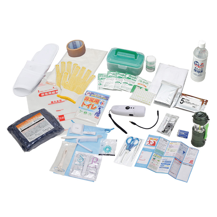 | ●リュック ●スマホ対応ダイナモFMラジオLEDライト ●2WAYランタン ●単3電池×3本 ●保存水500ml ●シュラフ ●非常用給水バッグ5L ●防災用ウエットティッシュ ●防寒シート ●ホイッスル ●すべり止め手袋 ●非常用トイレ ●ポケットティッシュ ●ゴミ袋45L(10枚)半透明 ●スリッパ ●布テープ ●防災ガイド ●救急箱 ●カット×綿3枚 ●カットガーゼ×3枚 ●包帯 ●救急絆創膏2サイズ×3枚 ●サージ カルテープ ●清浄綿2枚入×3包 ●ハサミ ●ピンセット ●耳かき ●毛抜き ●宿泊セット用ポーチ ●カミソリ ●ハブラシセット ●二つ折りコンパクトブラシ ●シャンプー&リンス ●石鹸 ●タオル ●ヘアーバンド |