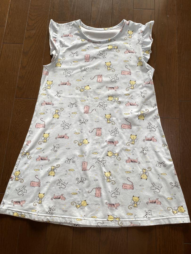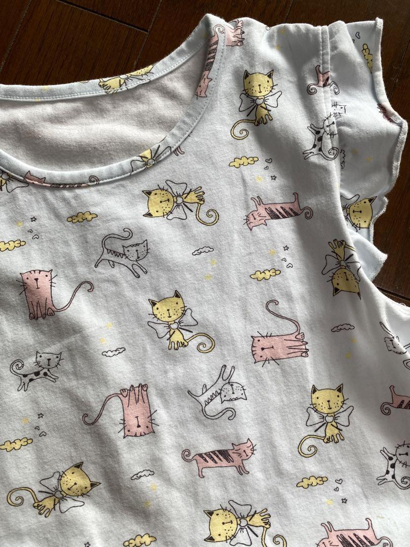 水色のワンピースには猫と雲のプリントが施されており、遊び心満載です。