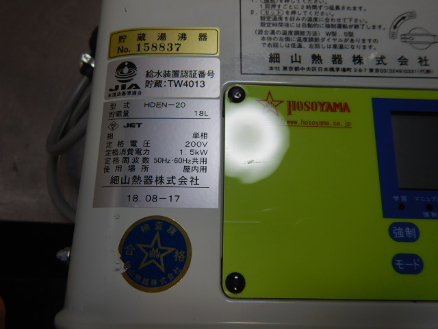 2018年製 細山熱器 HDEN-20 電気温水器 壁掛け 単相200V 用 1.5kw ~99℃ 給湯器 18L W415D261H615mm 10kg