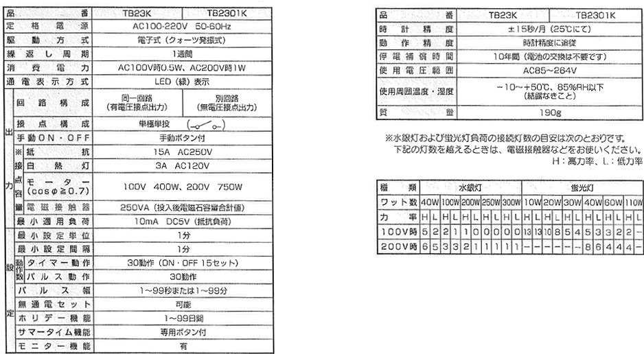 松下製 ボックス型電子式タイムスイッチ(1回路型)(別回路型) TB2301 無電圧接点出力 電源AC100-220V です。 ★写真の様に汚れ、傷はなく、美品です。 到着後1ヶ月以内の不具合には返金など、きちんと対応します。 ★最大30プログラム設定できます。 ★ホリデー機能で、長期休暇や日祭日の設定が出来ます。 ★モニター機能で、動作時刻の確認が出来ます。実際の動作順にプログラムを表示できます。 ★パルス出力も可能です。パルス幅(ON時間)は1-99秒、または1-99分で設定できます。 取扱説明書などは下記リンクのページをご覧下さい。 Panasonic TB2301K ホームページ 送料全国一律450円(定形外郵便) インボイス対応領収書発行可能です。 |