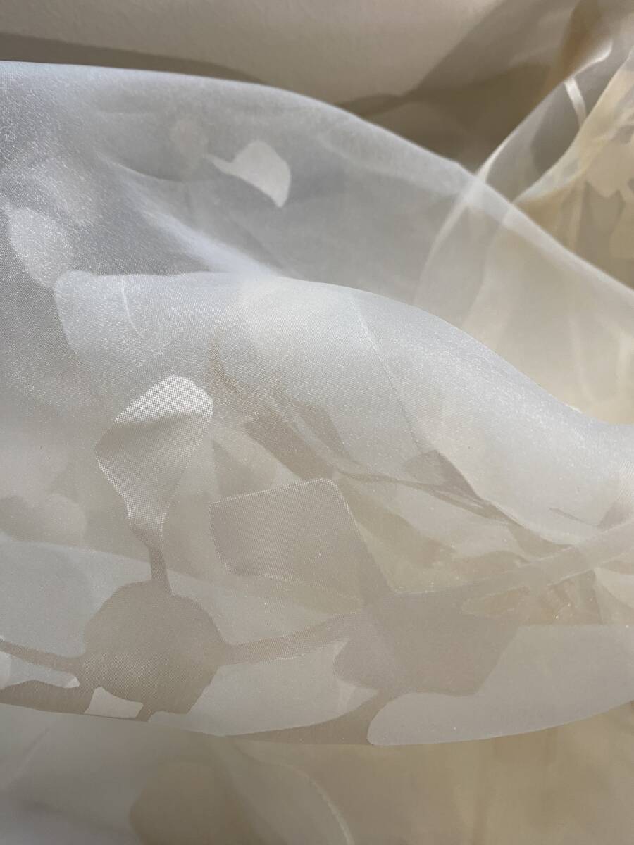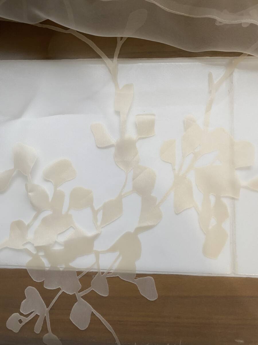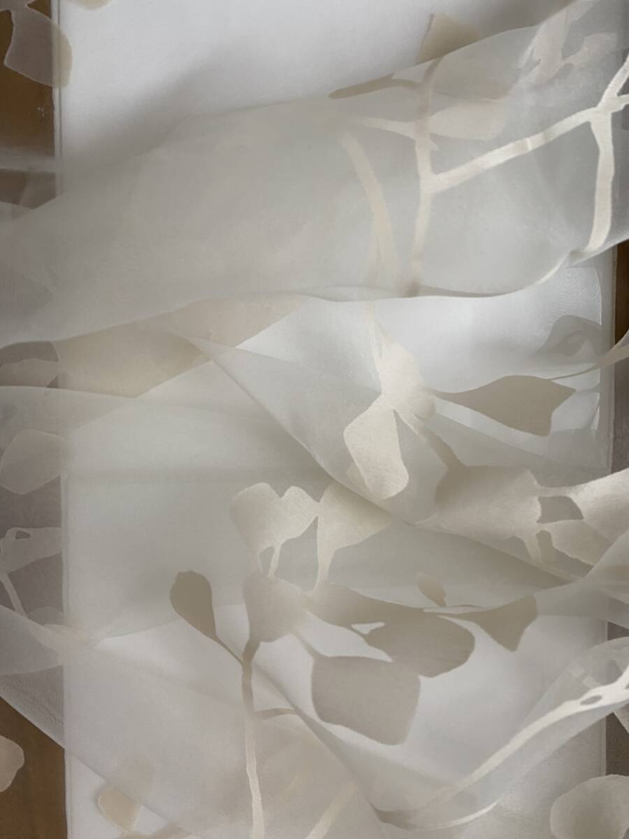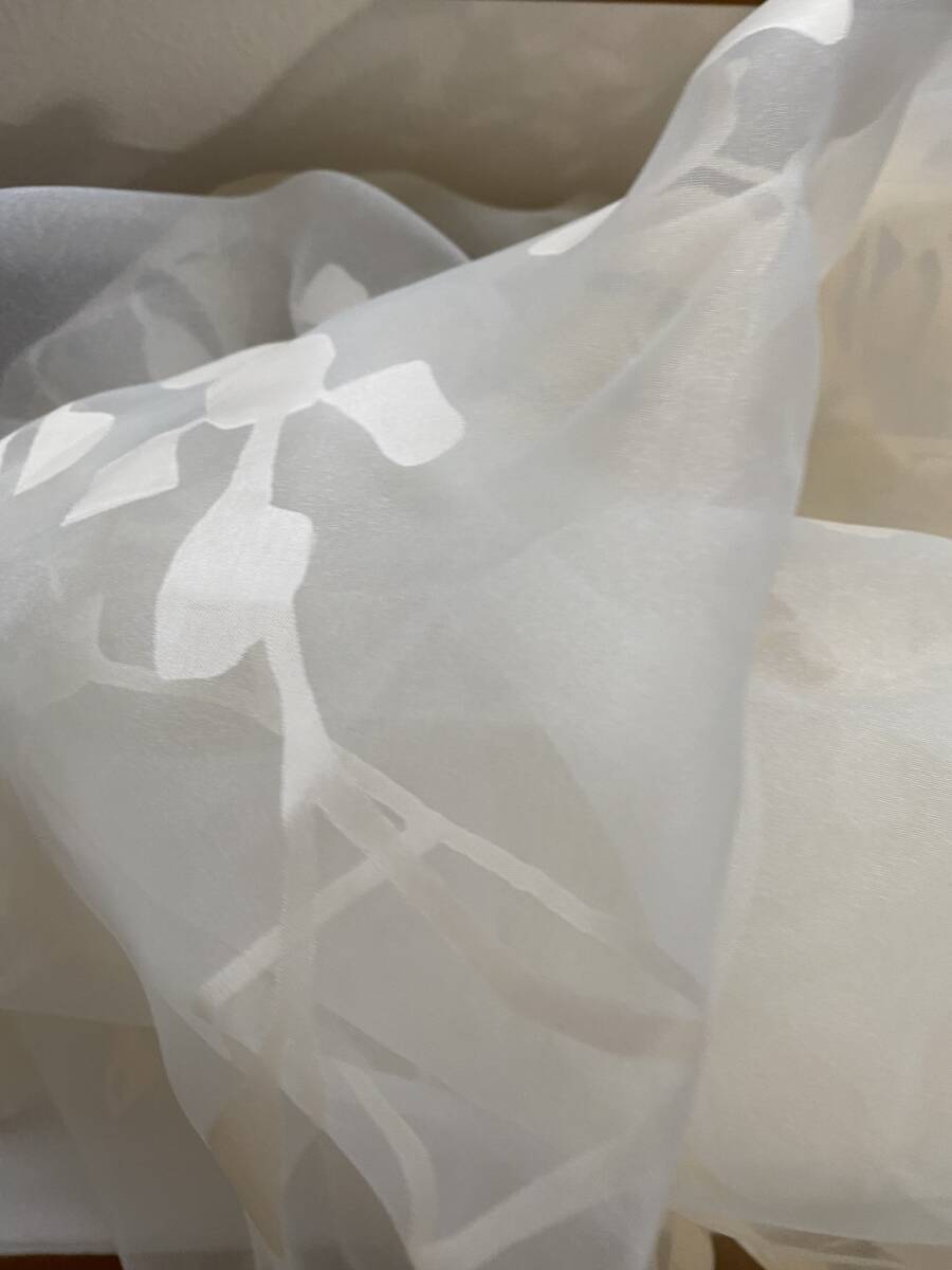 薄くて軽く、高級感のあるオーガンジーの様な生地です。ウエディングベールの様に、透け感があり、触った感じは少しハリがあります。