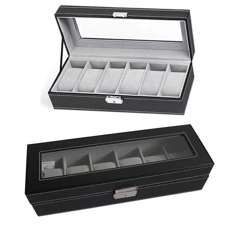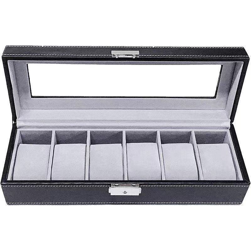 *素材* 合成皮革?ガラス *サイズ* 約幅30×奥行き11.5×高さ8cm *収納数* 腕時計6本収納 *商品説明* 重厚感を感じさせる高級ウォッチケースです。腕時計6本分が収納できる十分な収納力です。 時計を多くお持ちで置き場所に困っている方に、オススメです。ガラス正面で毎朝どちらの時計を付けるか選びやすいです。海外製なので,本体にキズ、製造工程で出る粉などが付着している場合がございます。ご了承ください。