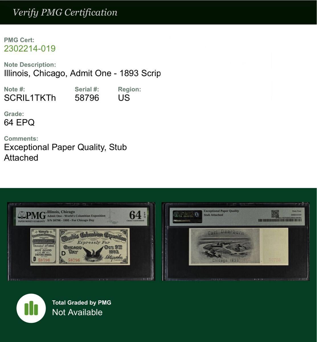 アメリカ合衆国《イリノイ州, シカゴ》〔世界コロンビア博覧会〕【1893】『PMGグレーディング鑑定 未使用 64 EPQ』