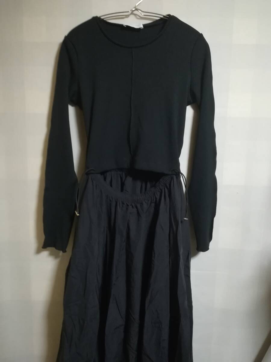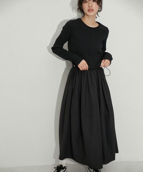 クロップド丈のリブカットソーと、ワッシャータフタのコクーンフレアスカートをコーディネートしたようなドッキングワンピース。コンパクトなトップスに、構築的なボリュームスカートが映える1枚。前ウエストがふらしになっており、サイドのドロストディテールでスカートのウエストサイズが調整可能。
