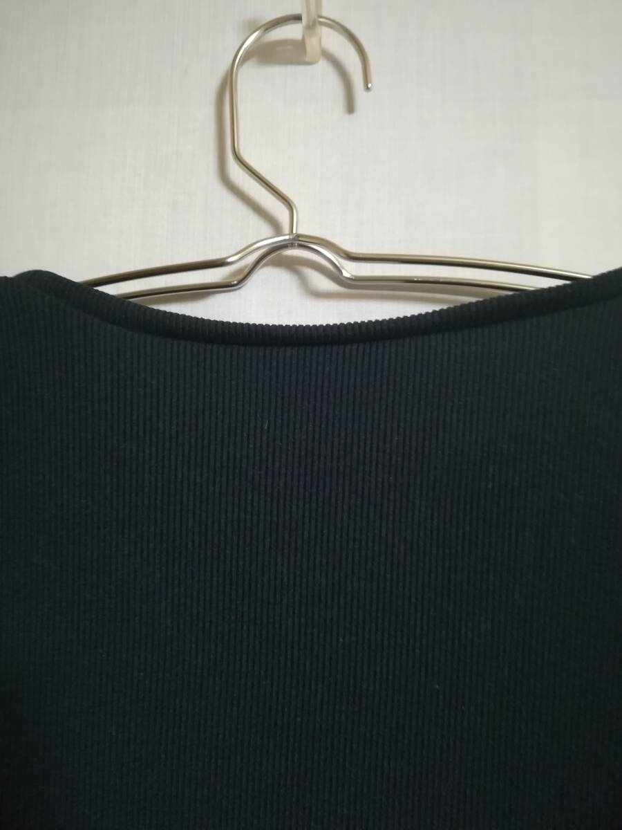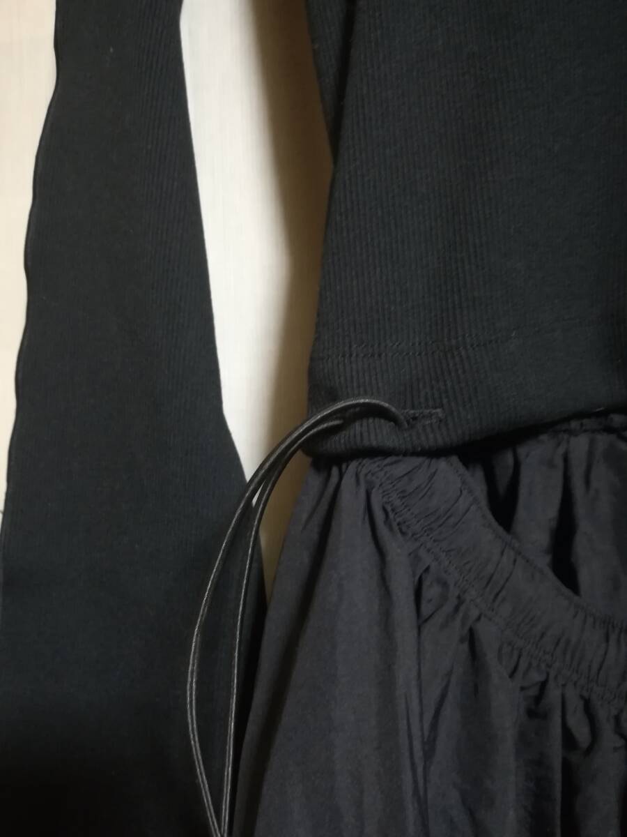 トップス:中肉のリブ組織のジャージー素材で、体のラインを拾いづらい厚手のリブ素材。使用済みペットボトルを原料にしたECOBLUEのポリエステルを使用。スカート:ワッシャーのかかったナイロンタフタ素材。