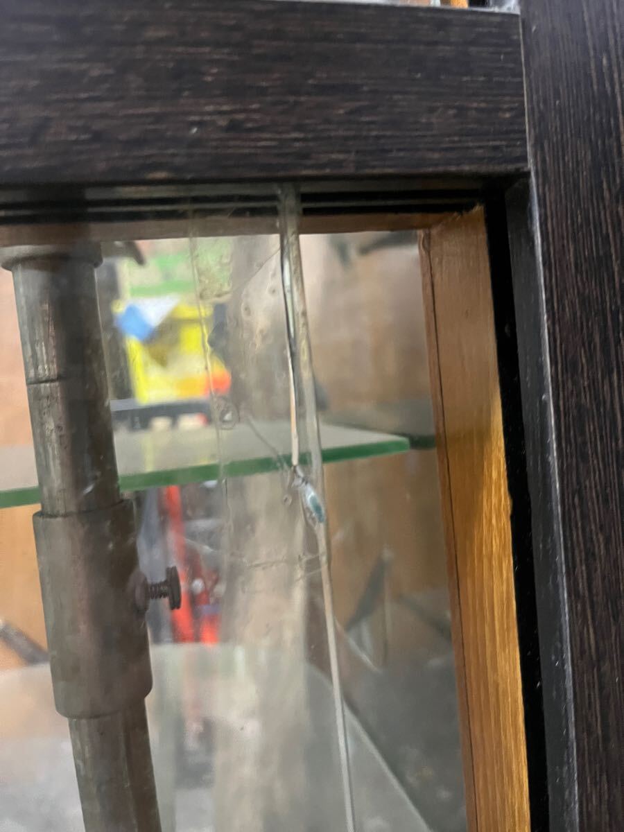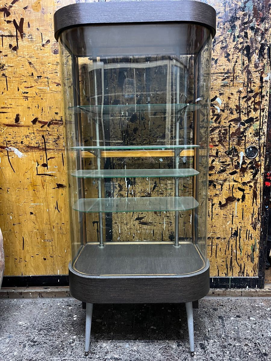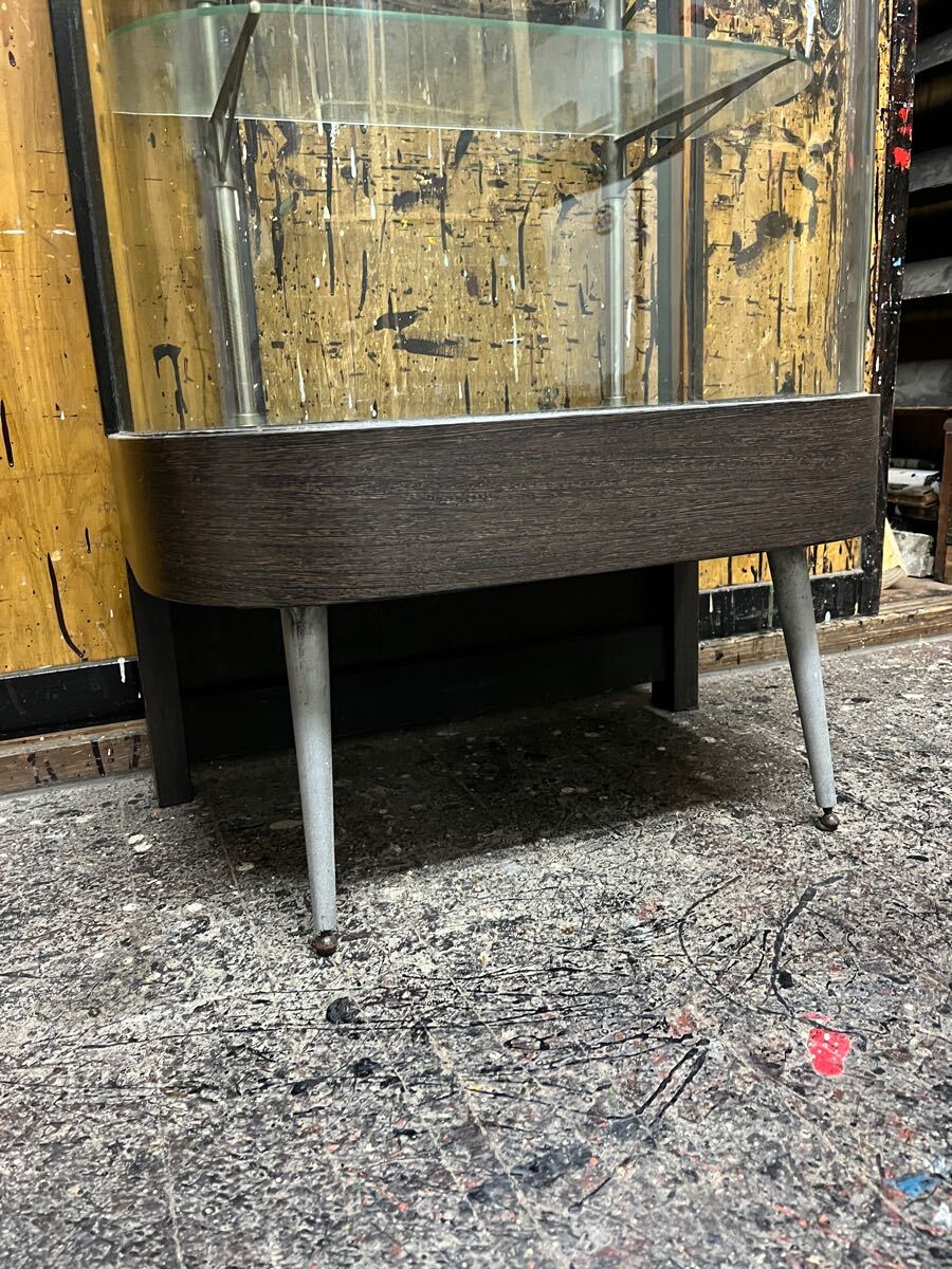 このガラスケースは、円筒形のスタイリッシュなデザインが特徴です。ブラウンの木製フレームが、温かみのある印象を与えます。