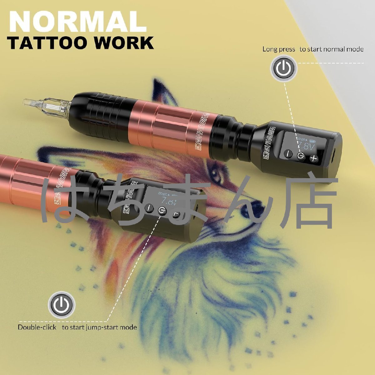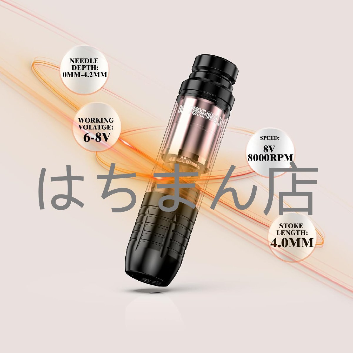 強力なモーター - タトゥーガンには高品質のモーターが搭載されており、高速、低ノイズ、安定した動作を実現します。ストローク:4mm、針の深さ0~4.2mm調整可能;スピード:8V 8000Rpm、ライナーやシェーダーに最適;強力なワイヤレスタトゥーマシンは、健康的で美しいタトゥーを仕上げるのに役立ちます。