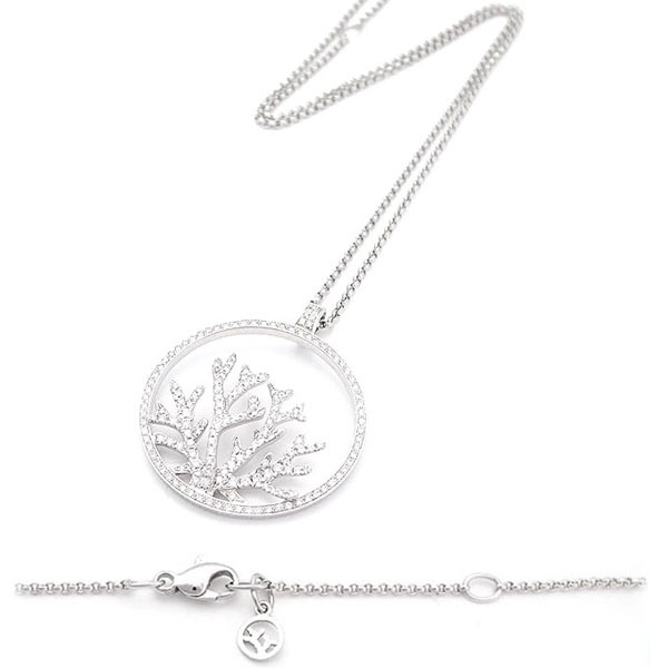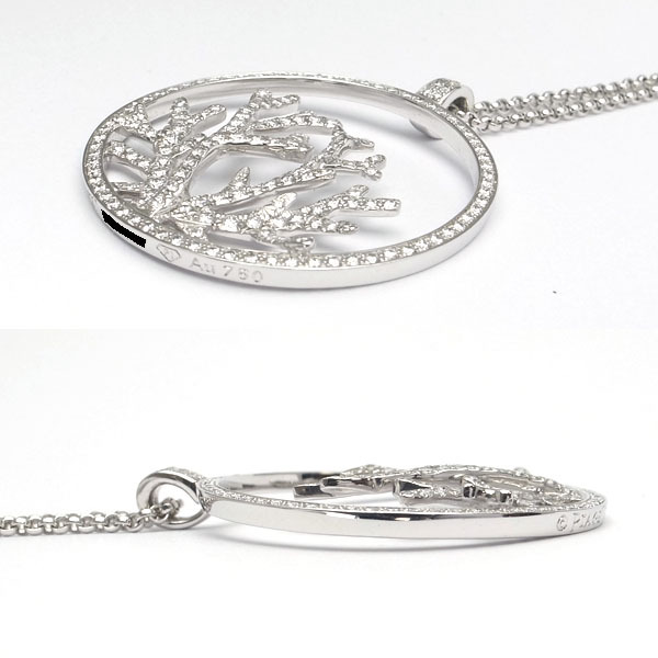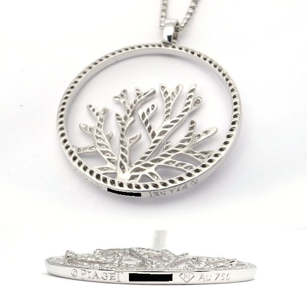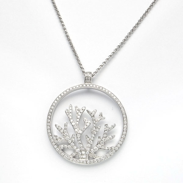 コメント まるで人間が容易にたどり着けない海の底の"パラダイス"からやって来たかのような、珊瑚の見事な枝を広げるペンダント。一本一本が立体的に前後した枝は、かすかに弧を描き、周りの円からドーム状に象られています。まばゆいきらめきをはなつ珊瑚がその軽やかさとインスピレーションによって、胸元にに海の底の詩的な美しさを描きます。ピアジェならではの繊細でエレガントなダイヤモンドネックレス。