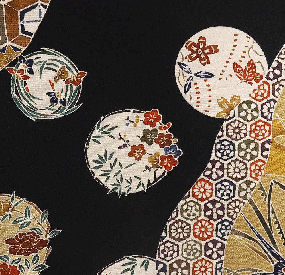 友禅訪問着 袷 一越縮緬地 紅型調 黒(漆黒色)・茶色(はしばみ色)・ベージュ(白磁色)地 亀甲文・丸文・雪輪文 茶屋辻・桜・松竹梅・菖蒲・花喰鳥 (写真では上手く色が出ない場合があります。ご了承下さい) |